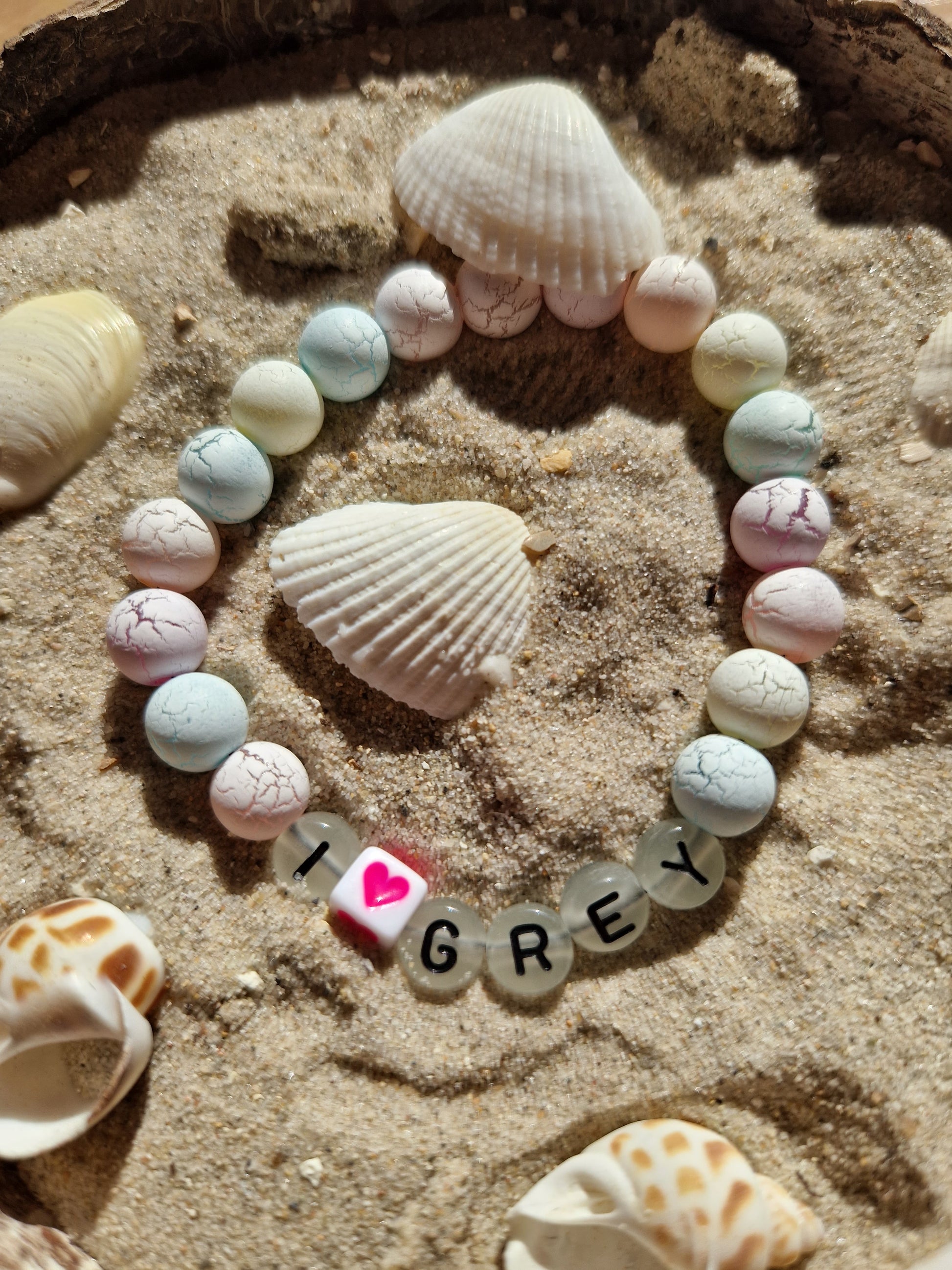 Bei diesem pastellfarbigen Armband leuchten die flachen Buchstaben in dunkeln.
