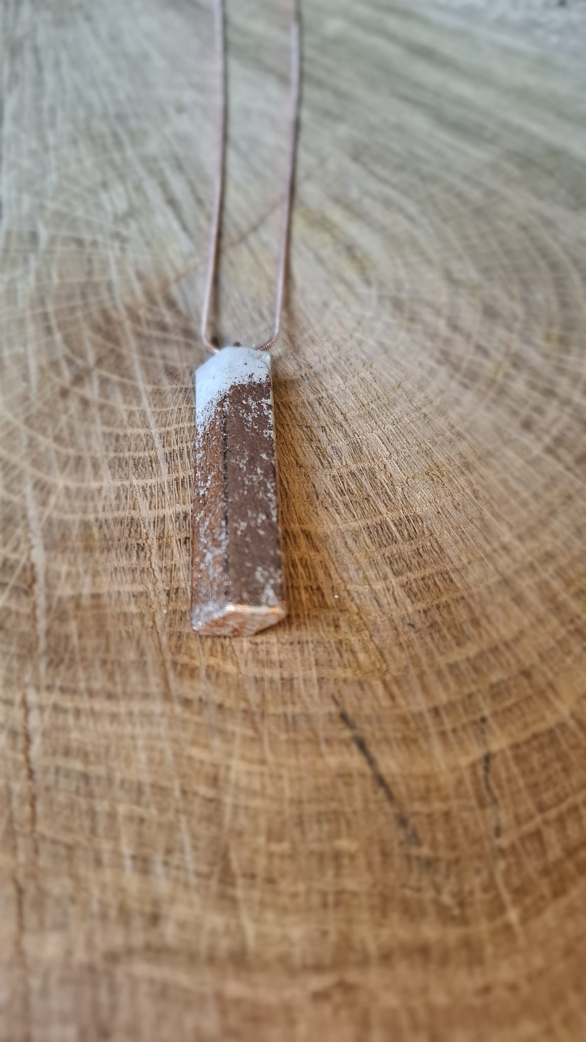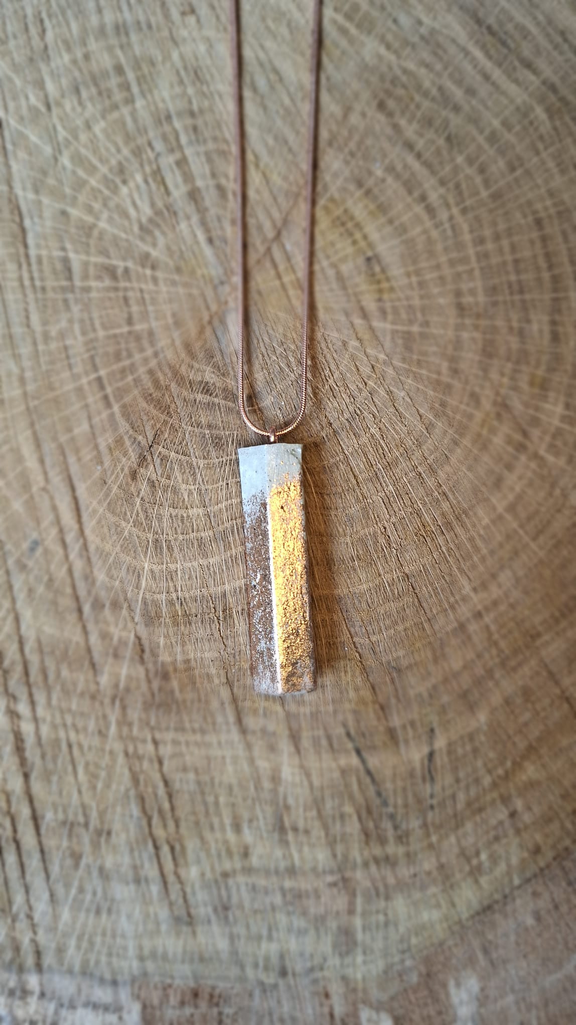 Die Kette besteht aus Modeschmuck und ist ca. 45 cm lang. Der Beton Anhänger hat eine Länge von ca. 5 cm.