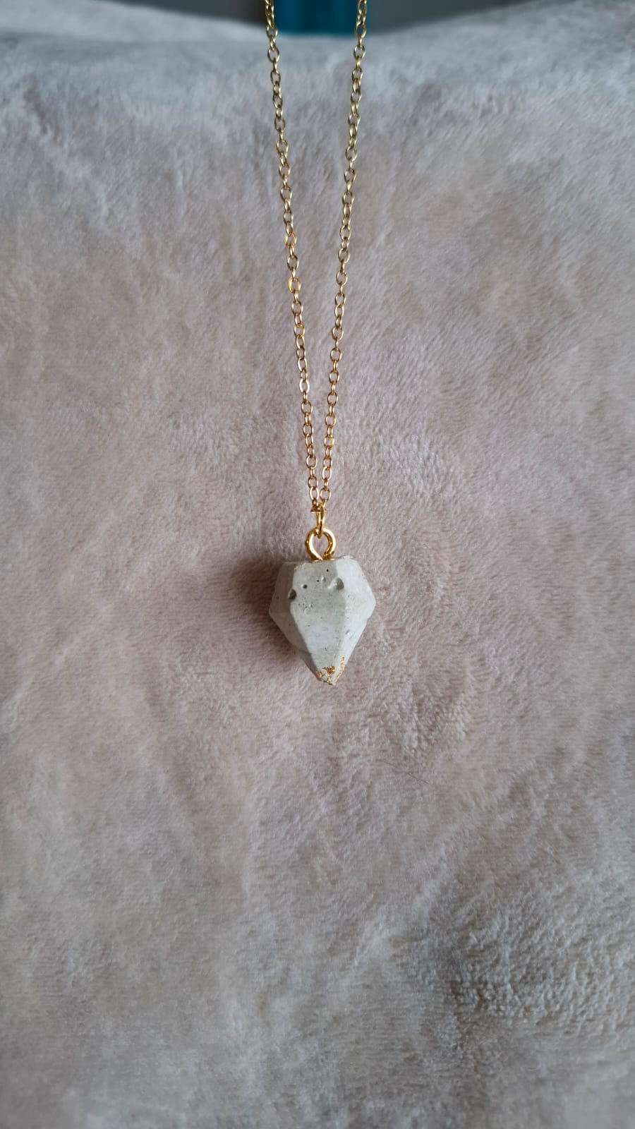 Der Anhänger besteht aus Beton mit leichten goldenen Elementen. Er ist angenehm leicht zu tragen und hat einen Durchmesser von 2 x 1,5 cm. Die Kette besteht aus Modeschmuck und hat eine Länge von 45 cm.