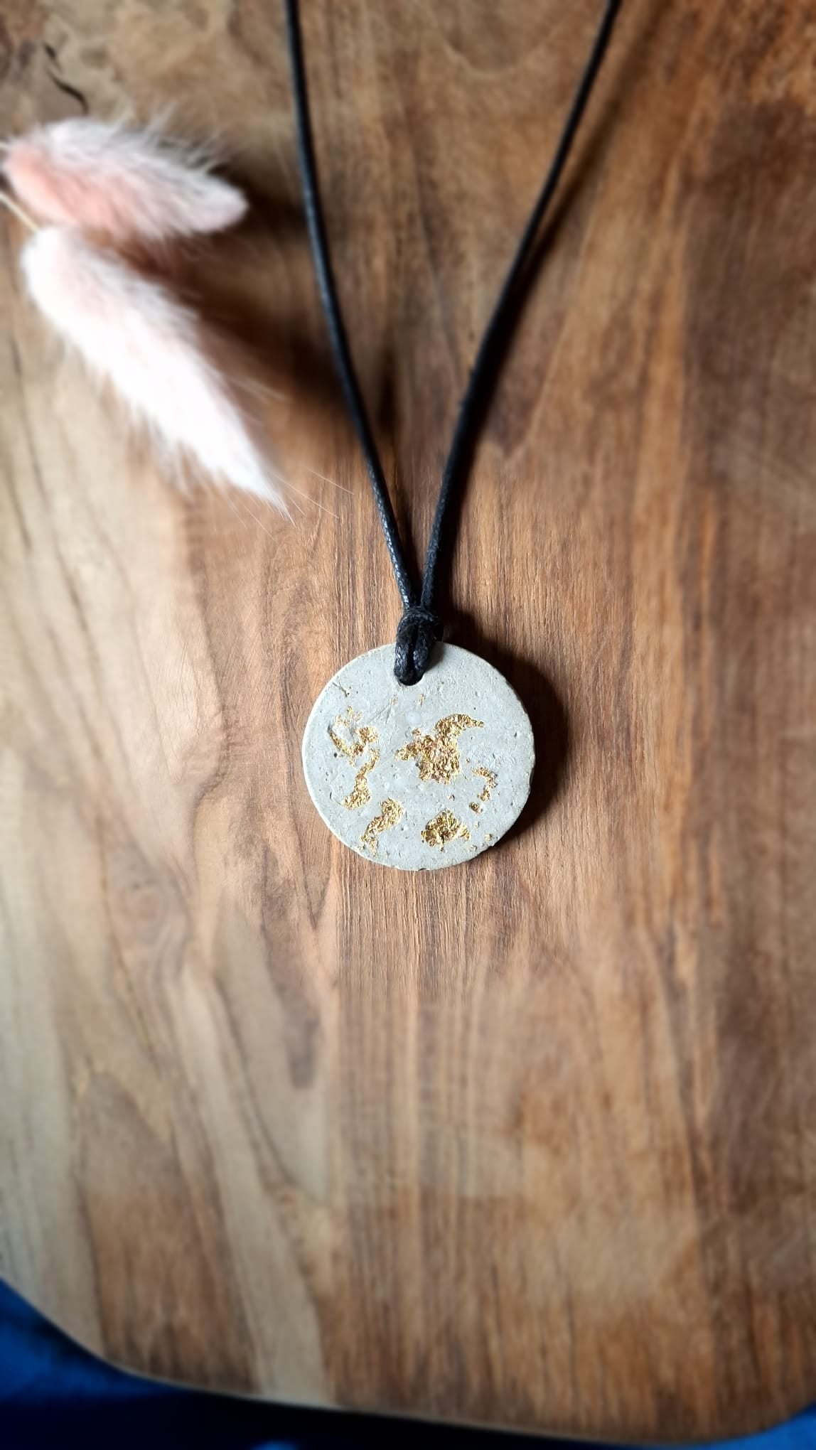 Der Anhänger besteht aus Beton und hat einen Durchmesser von 3,5 cm. Das Vegane Lederband hat eine Länge von ca. 76 cm.