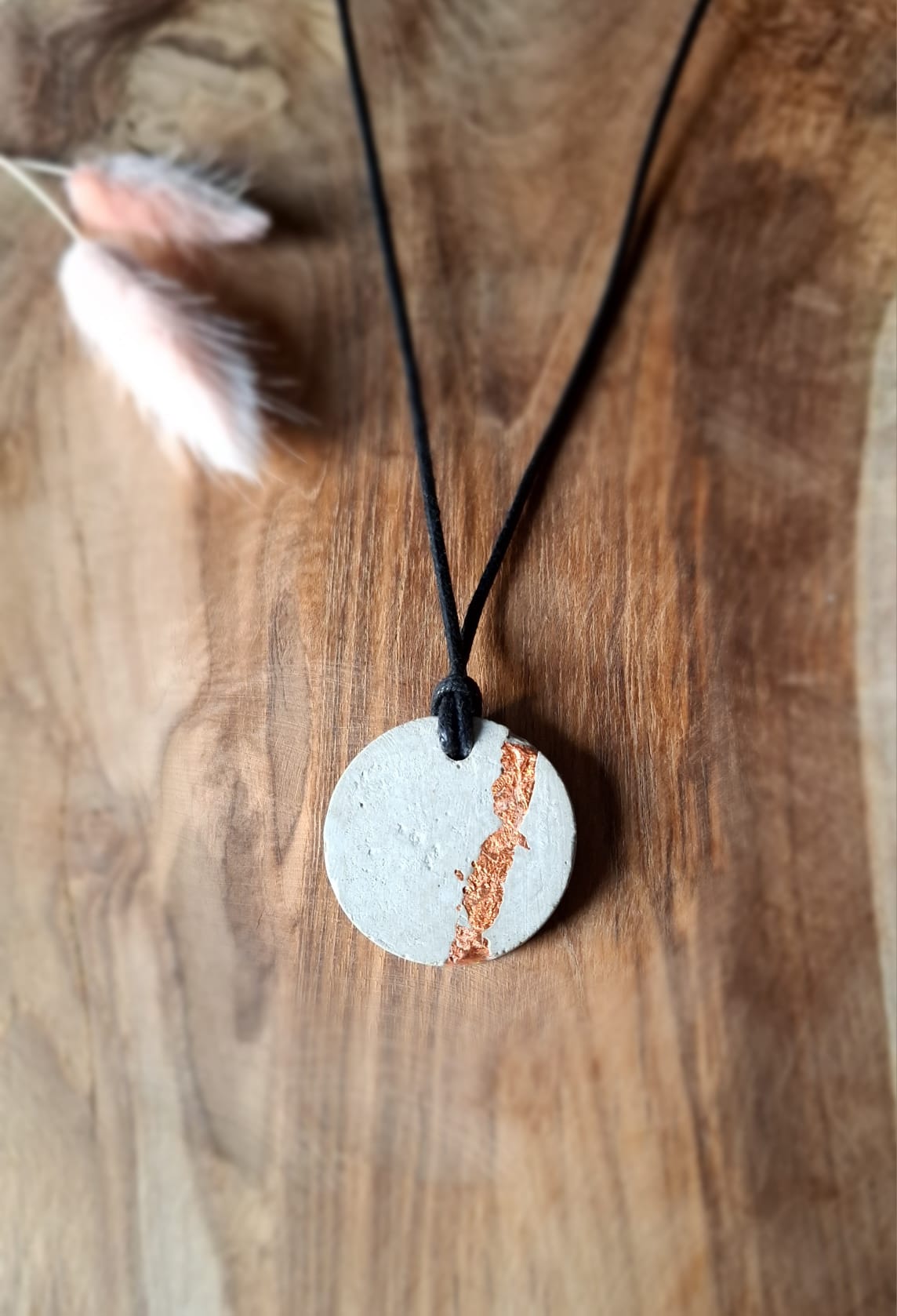 Der Anhänger besteht aus Beton und hat einen Durchmesser von 3,5 cm. Das Vegane Lederband hat eine Länge von ca. 76 cm.