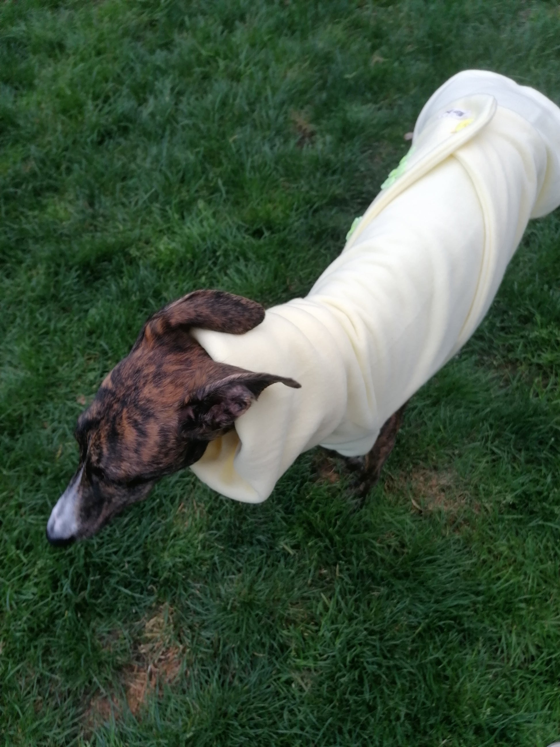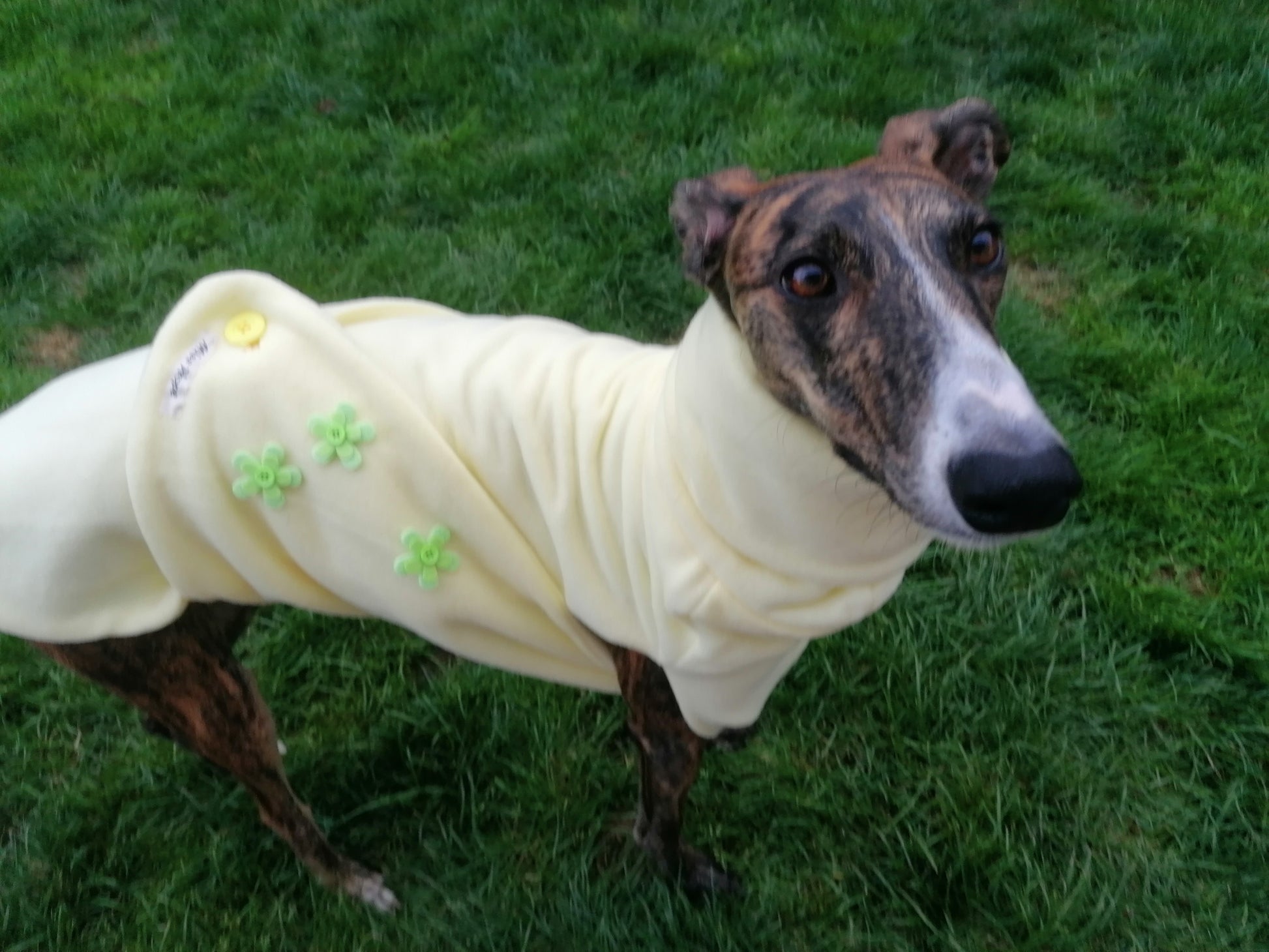 Die Rückenlänge beträgt 66cm, der Halsumfang 40 cm und der Bauchgurt 66 cm. Er ist für kleine zarte Galgos, aber auch Whippeds geeignet.