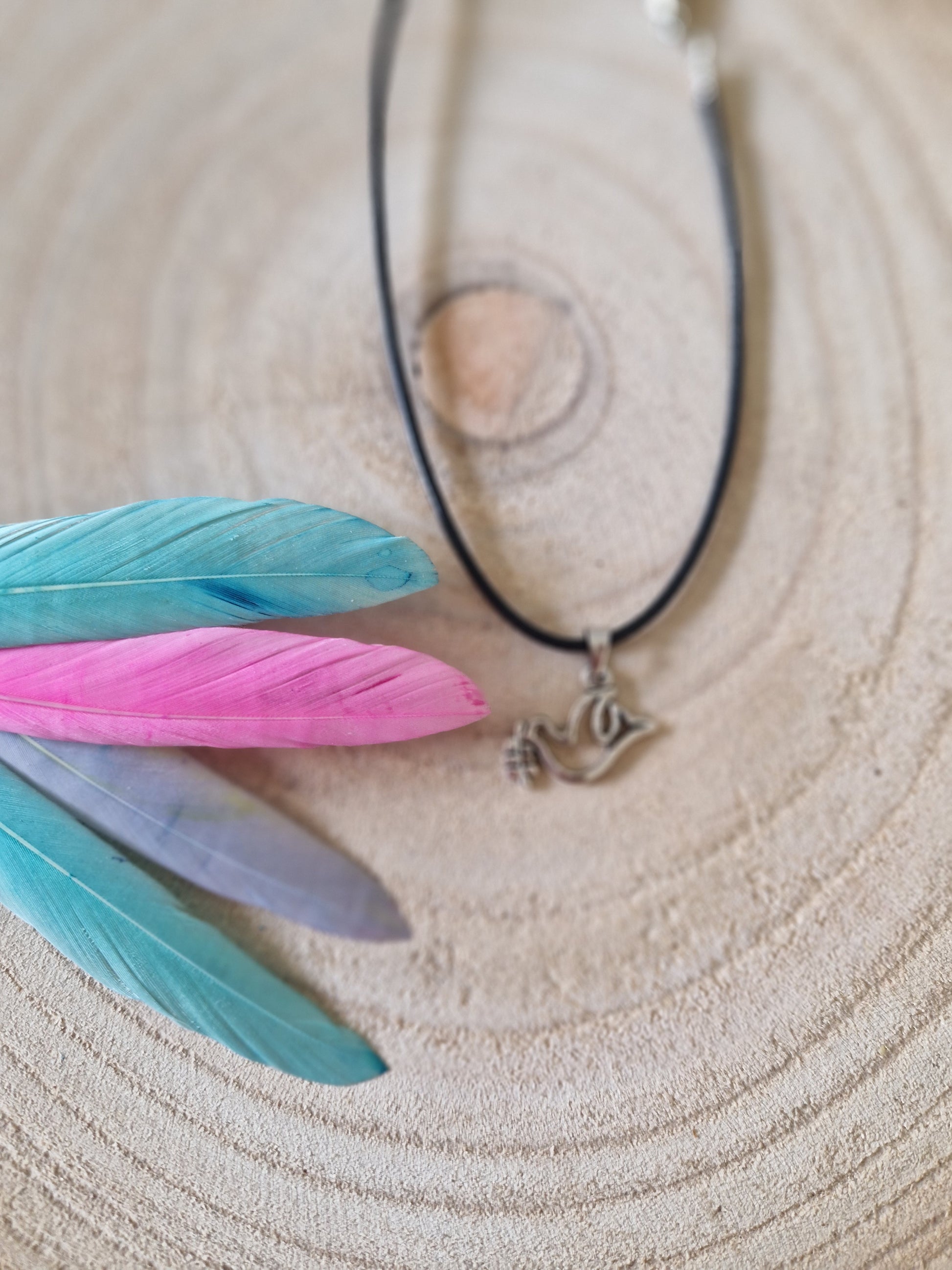 Die Halskette ist aus unechtem Leder und auf mehreren Stufen einstellbar. Die Friedenstaube ist 1,1cm x 1,8cm groß und abnehmbar. Sie ist aus Modeschmuck.