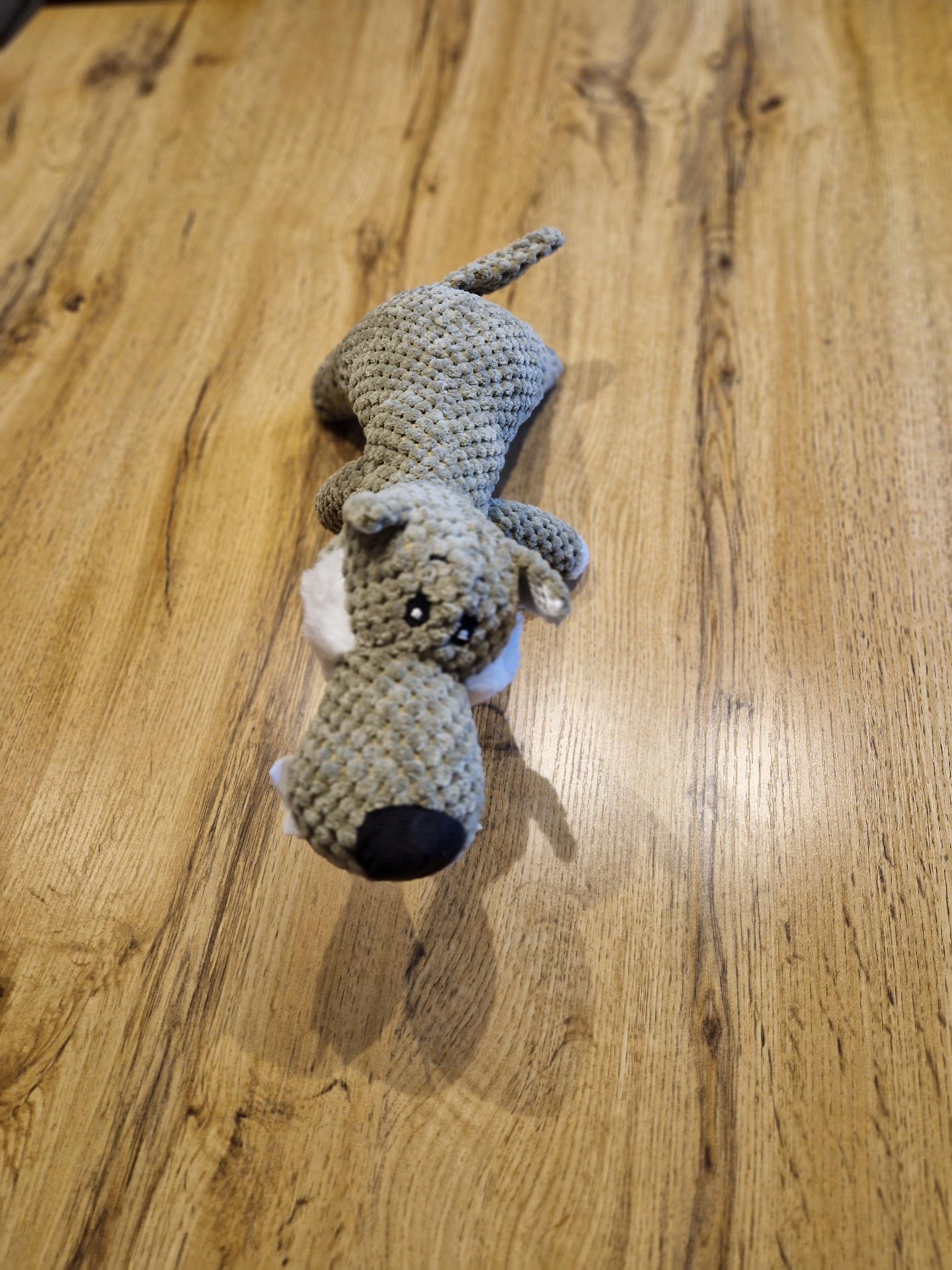 Der lustige Fuchs ist 37 cm lang und 16 cm breit. In der Mitte befindet sich ein Quitschi.