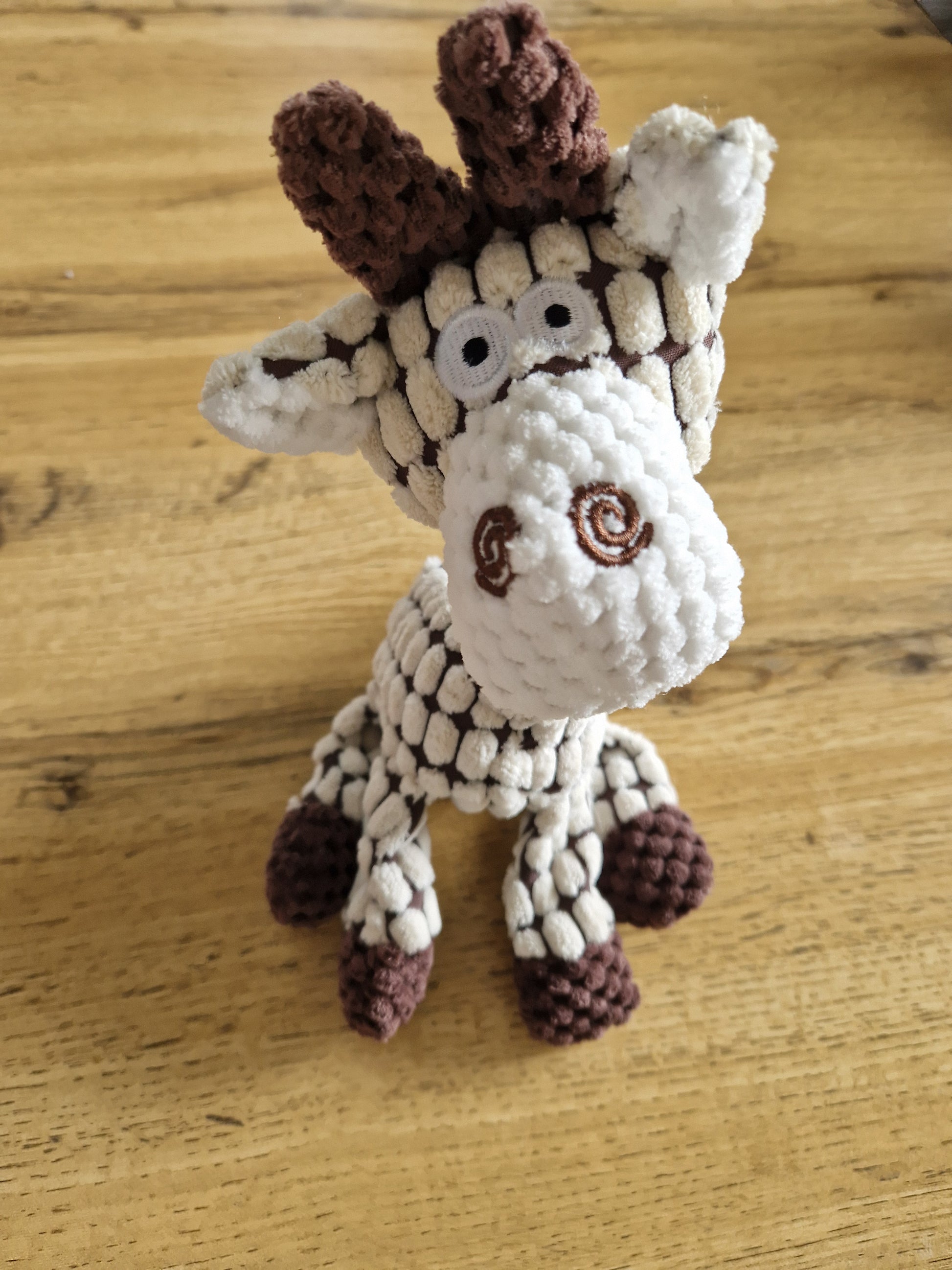Die süße Giraffe ist ca. 25 cm hoch und ca. 14 cm breit. Der Kopf ist mit einer dicken Cordell verbunden. Sie hat kein quitschi.
