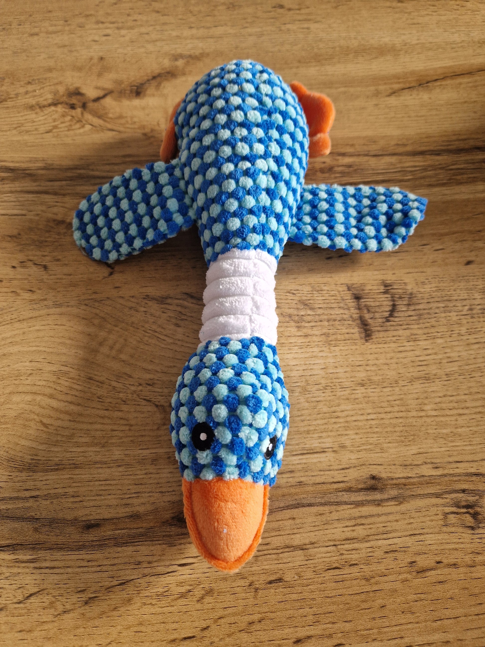 Die blaue Ente ist 30 cm lang und hat eine Flügelspannweite von 23 cm. Am Po befindet sich ein quitschi.