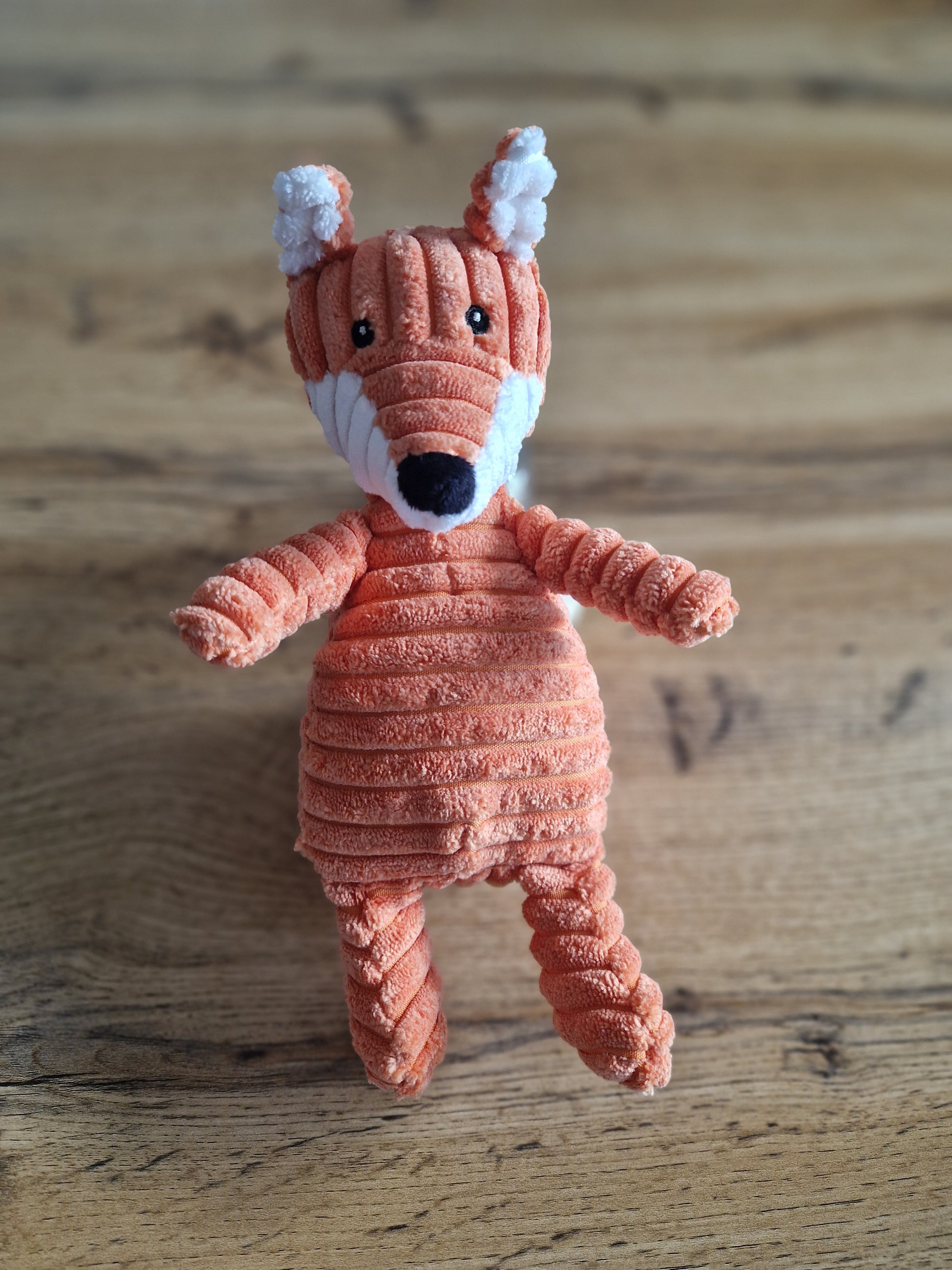 Der niedliche Fuchs ist 25 cm lang und 17 cm breit. In seinem Bauch befindet sich ein quitschi.