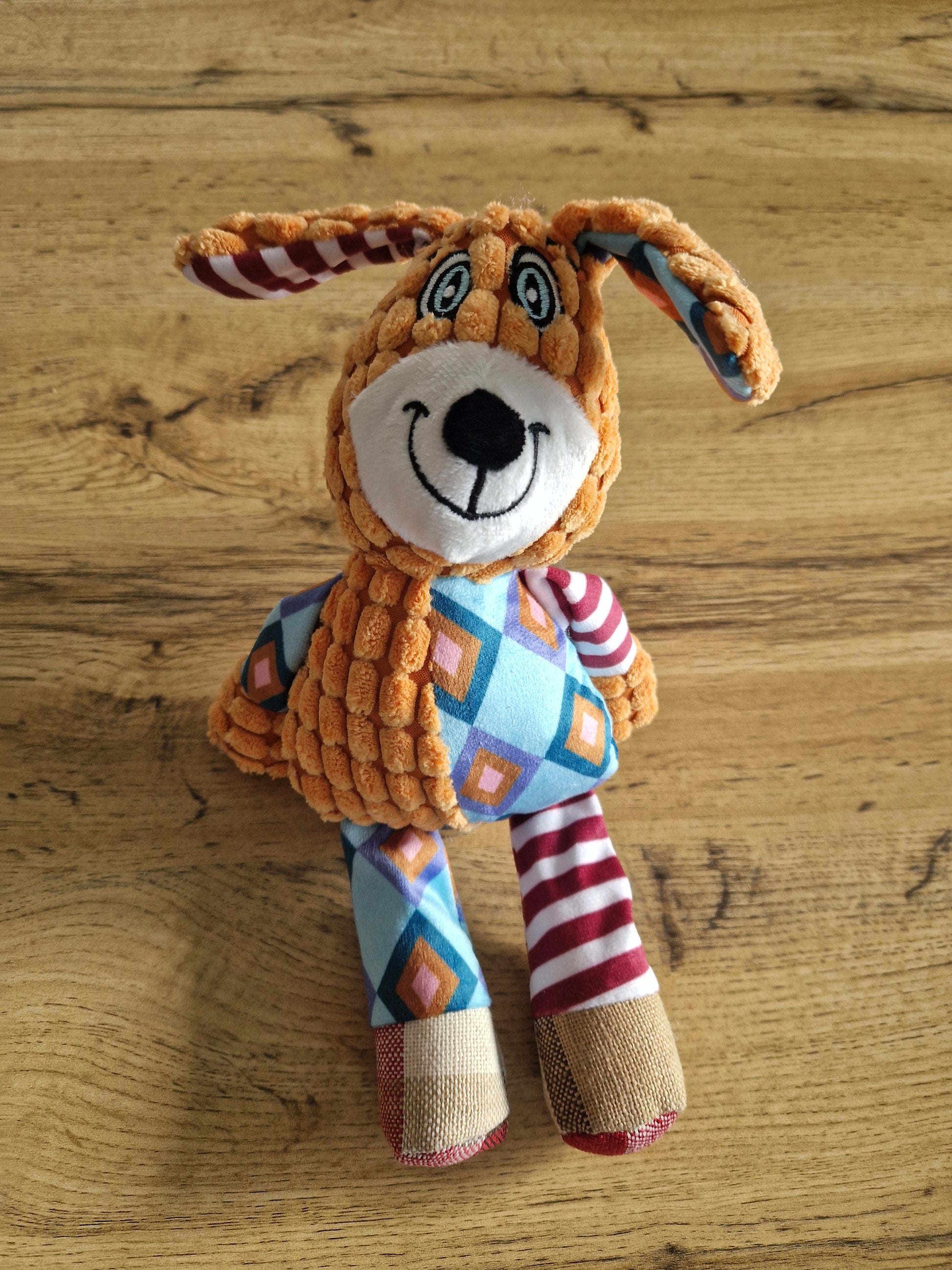 Dieses kuschelige Spielzeug ist 30 cm lang und 23 cm breit. Auch hier versteckt sich ein quitschi im Bauch.