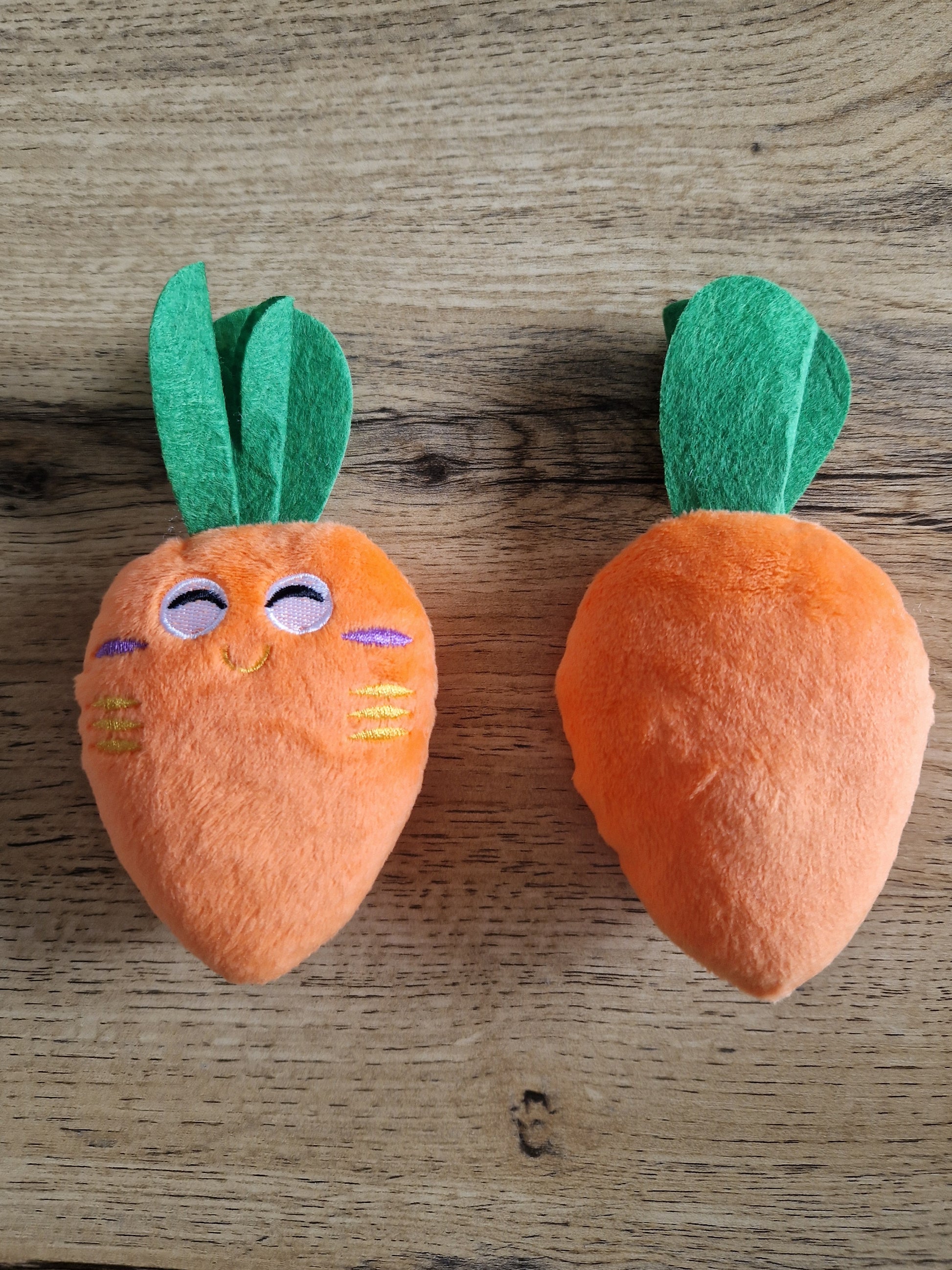 Die süße Karotte ist ca. 14 cm hoch und ca. 7 cm breit. Sie hat einen eingebauten quitschi.