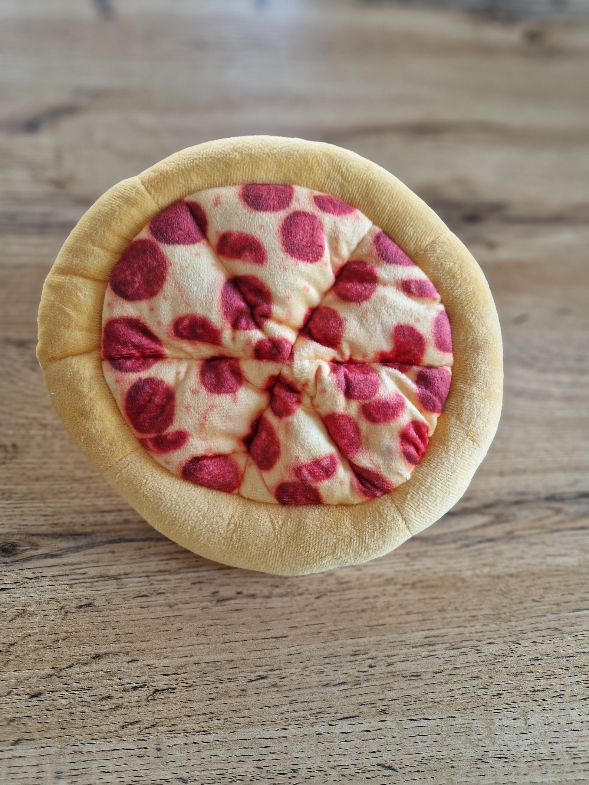 Jedes Stück ein Quietschi. Dieses lustige Hundespielzeug hat in jedem Pizzastück ein Quietschi. Es hat einen Durchmesser von 23 cm.