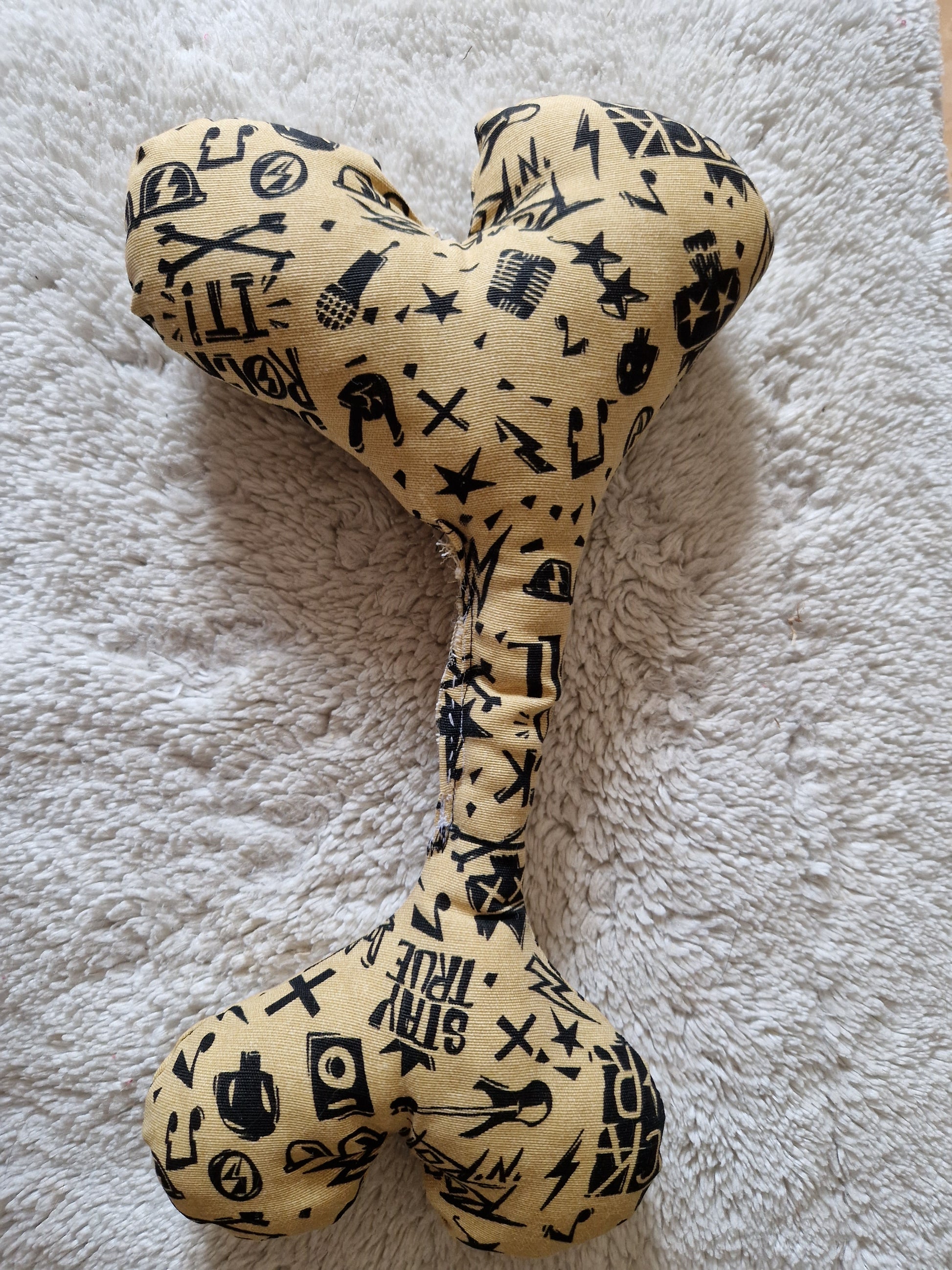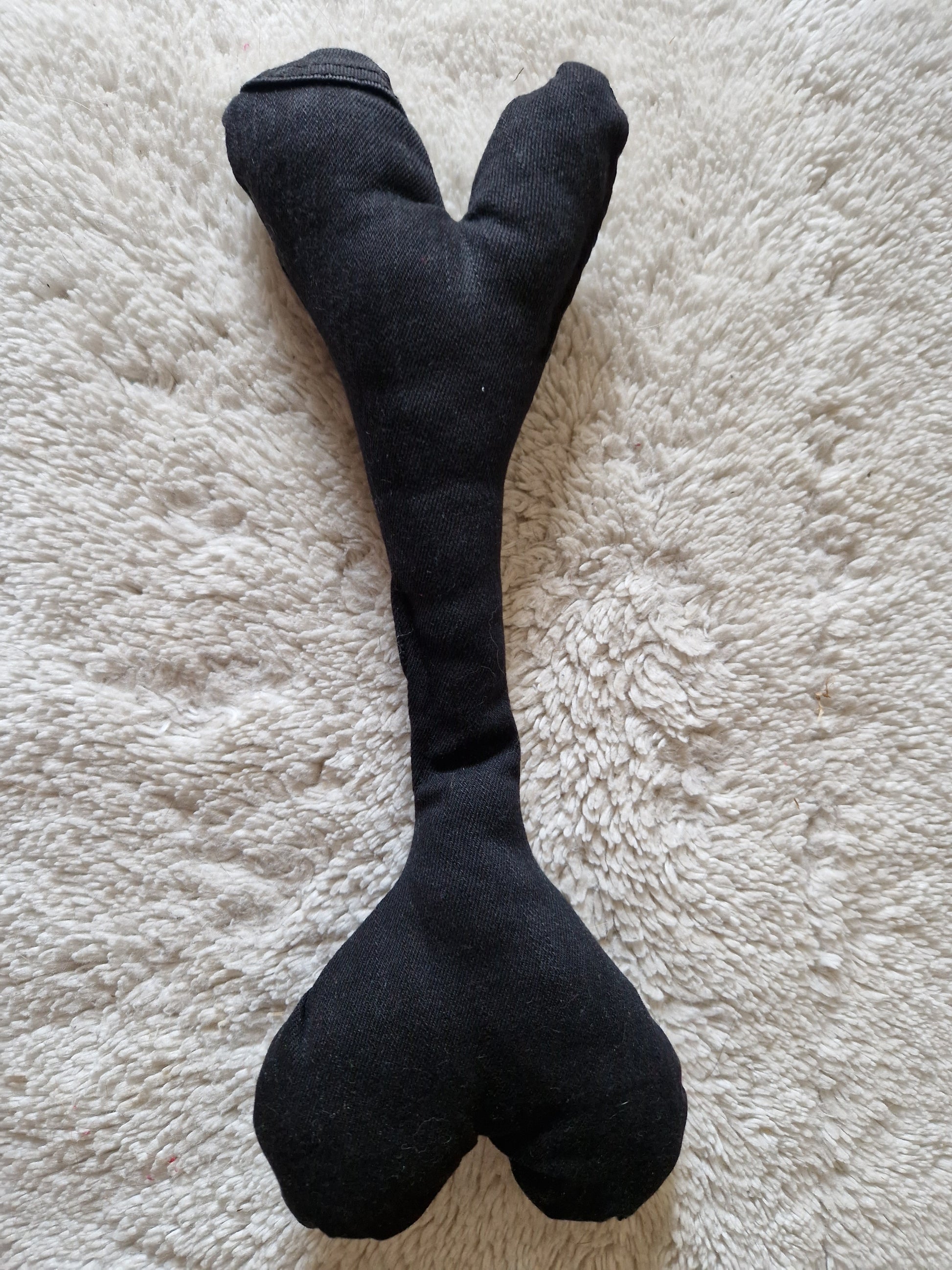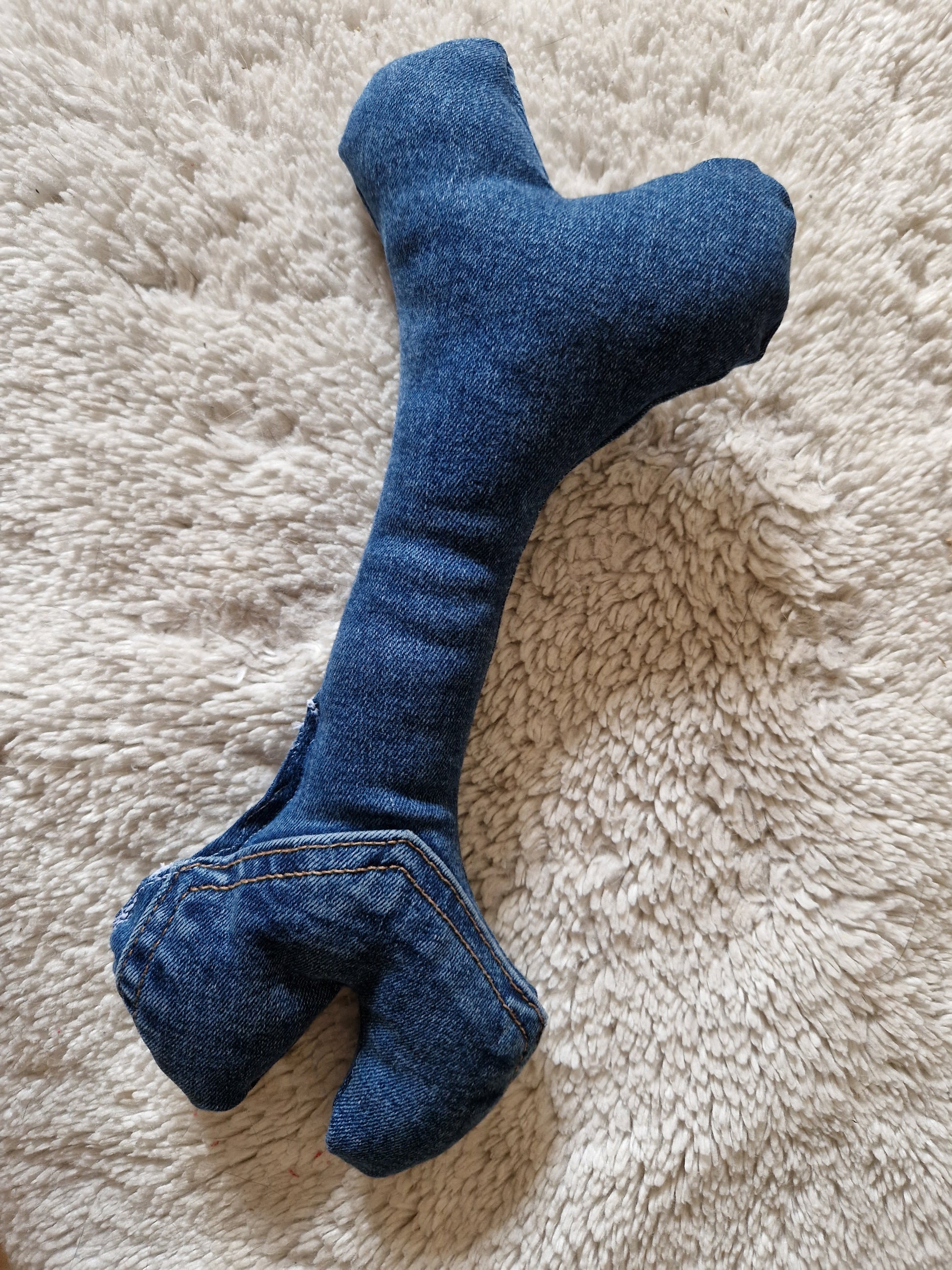 Dieses Recycling Spielzeug besteht aus einer alten Jeans oder robusten Stoffresten. Außerdem aus neuer Füllwatte die besonders für allergieger geeignet ist. Sie ist es waschbar und verklumpt nicht. Jeder Knochen ist ca. 32 cm lang.