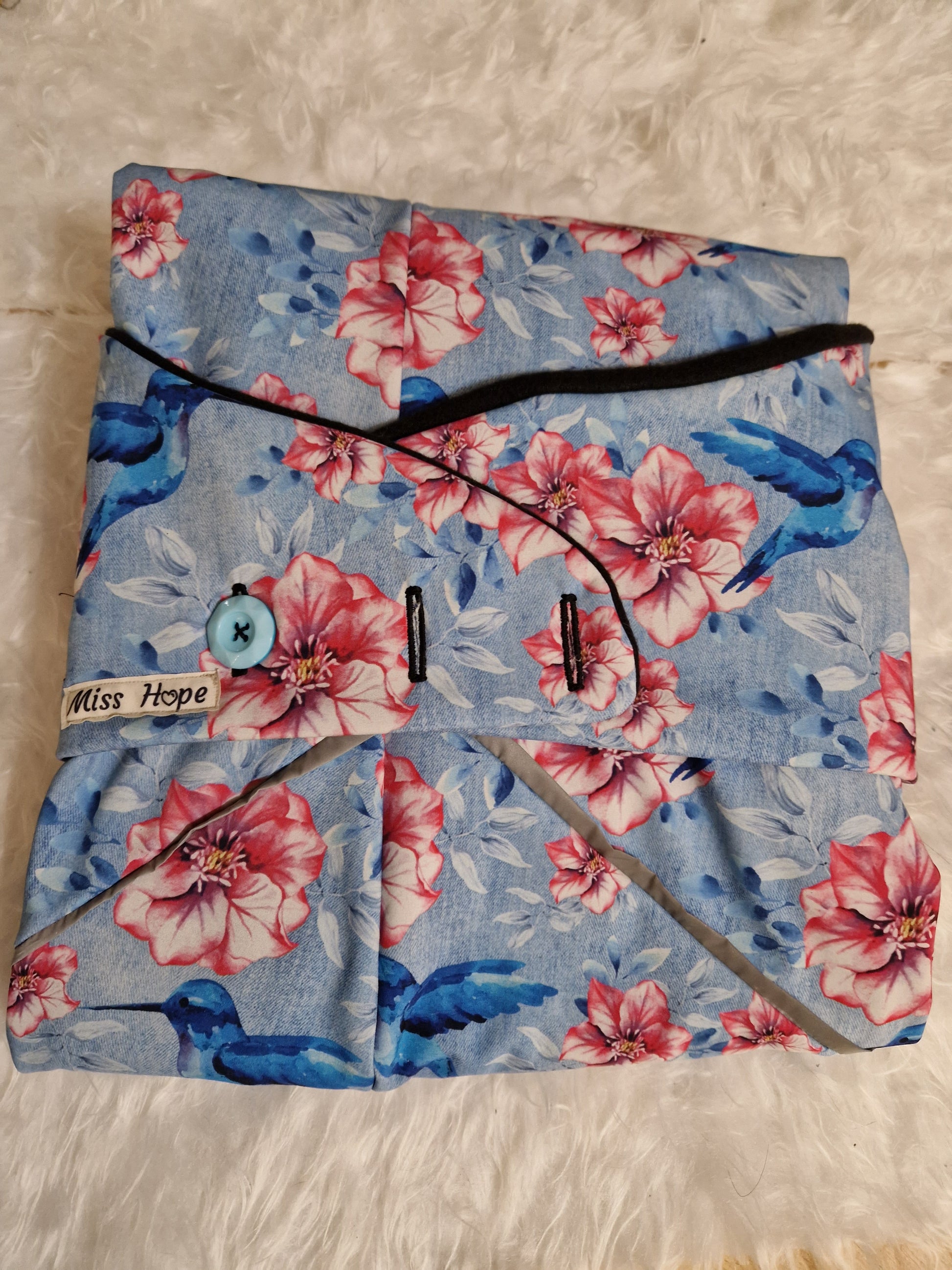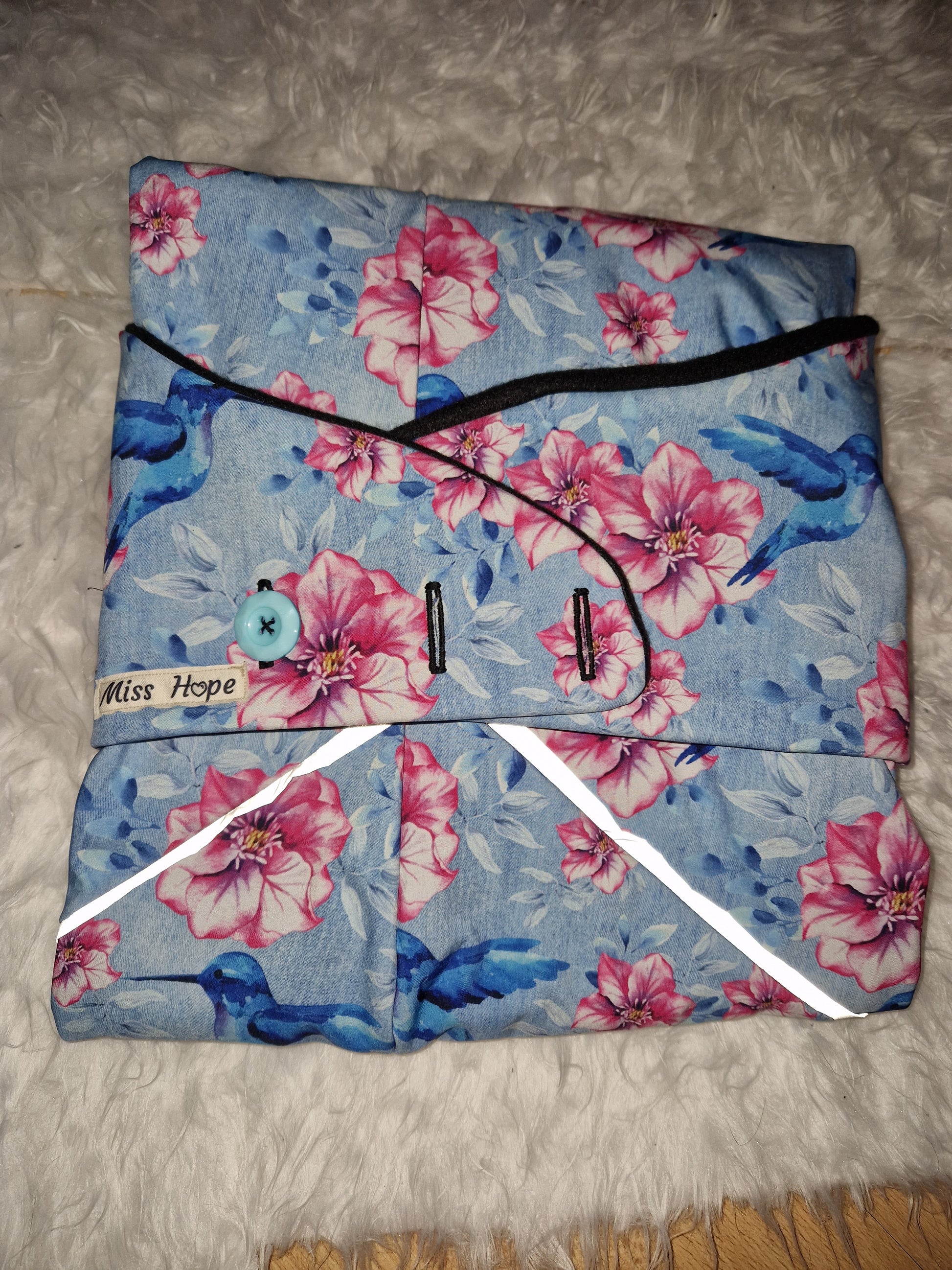 Dieser Mantel ist außen mit einem hellblauen Kolibri & Blüten Softshell Stoff genäht. Hinten befinden sich zarte Reflexionsstreifen. Von innen wurde er mit schwarzen Fleece verarbeitet. Daher hält er richtig schön war. Der Mantel ist Wind und Wasserabweisend, Atmungsaktiv, strapazierfähig und schränkt die Langnase nicht beim flitzen ein. Wie alle anderen Mäntelchen von Miss Hope lässt er sich mit einem Knopf auf 5 Stufen verschließen und man muss keine lange Beinchen durch ein Loch pressen.