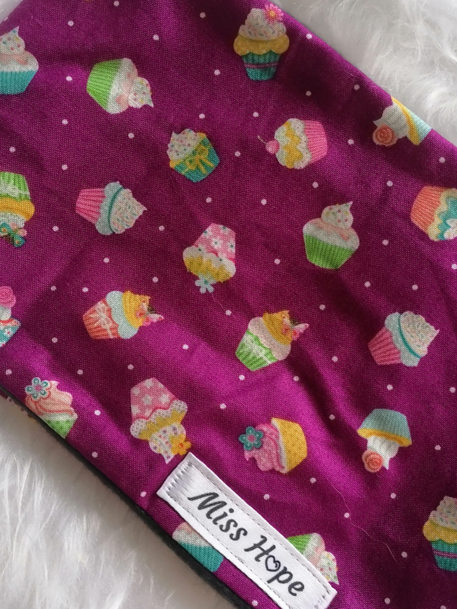 Diesr Loop hat innen eine dunkel grauen Fleece und von außen ein Baumwollgewebe Stoff in lila, mit kleinen Cupcakes und Punkten als Muster drauf.