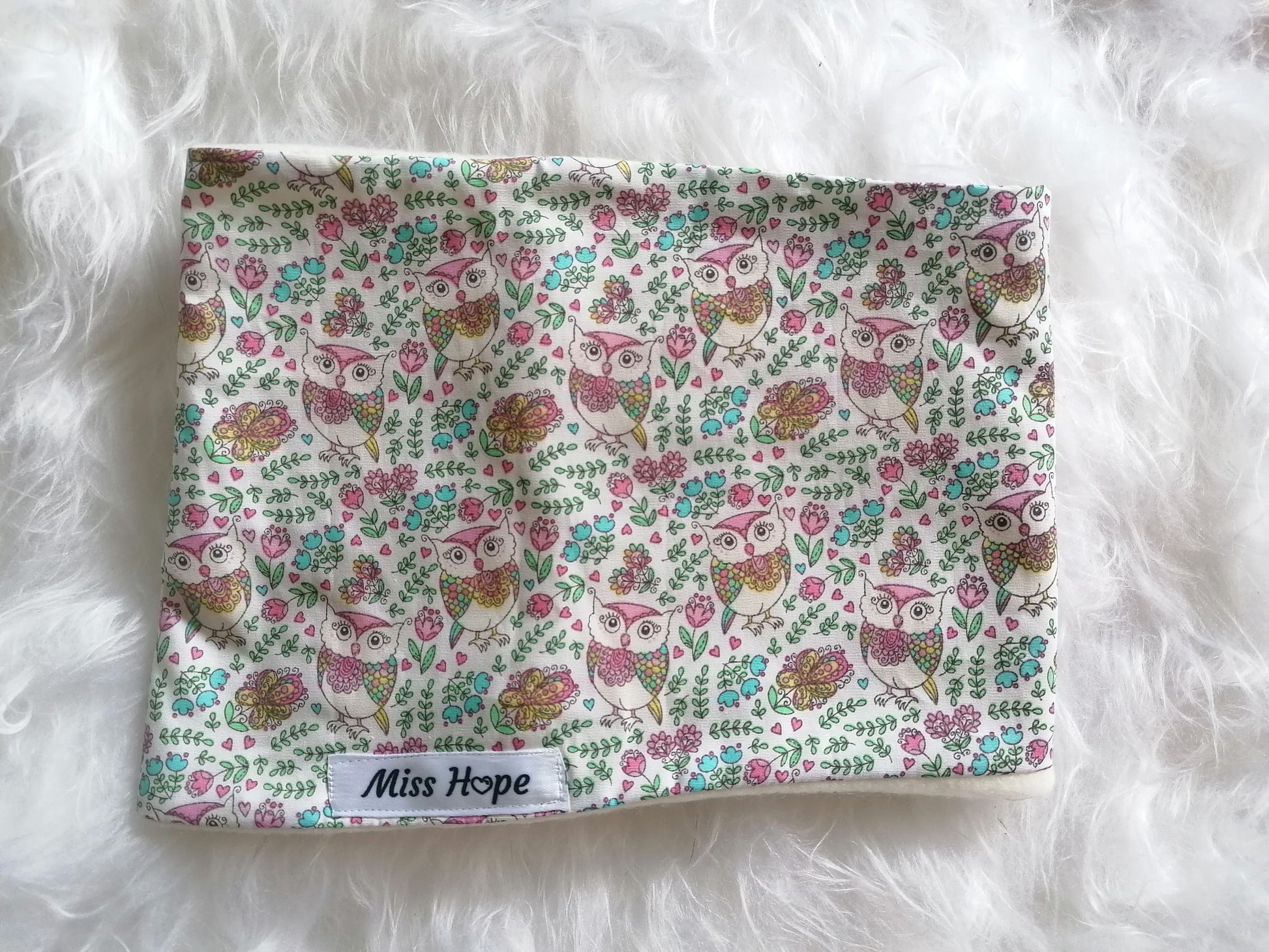 Der Loop hat ein weissen innen Fleece und von außen ein Baumwollgewebe Stoff. Dieser ist weiss mit Eulen und Pastellfarben drauf.