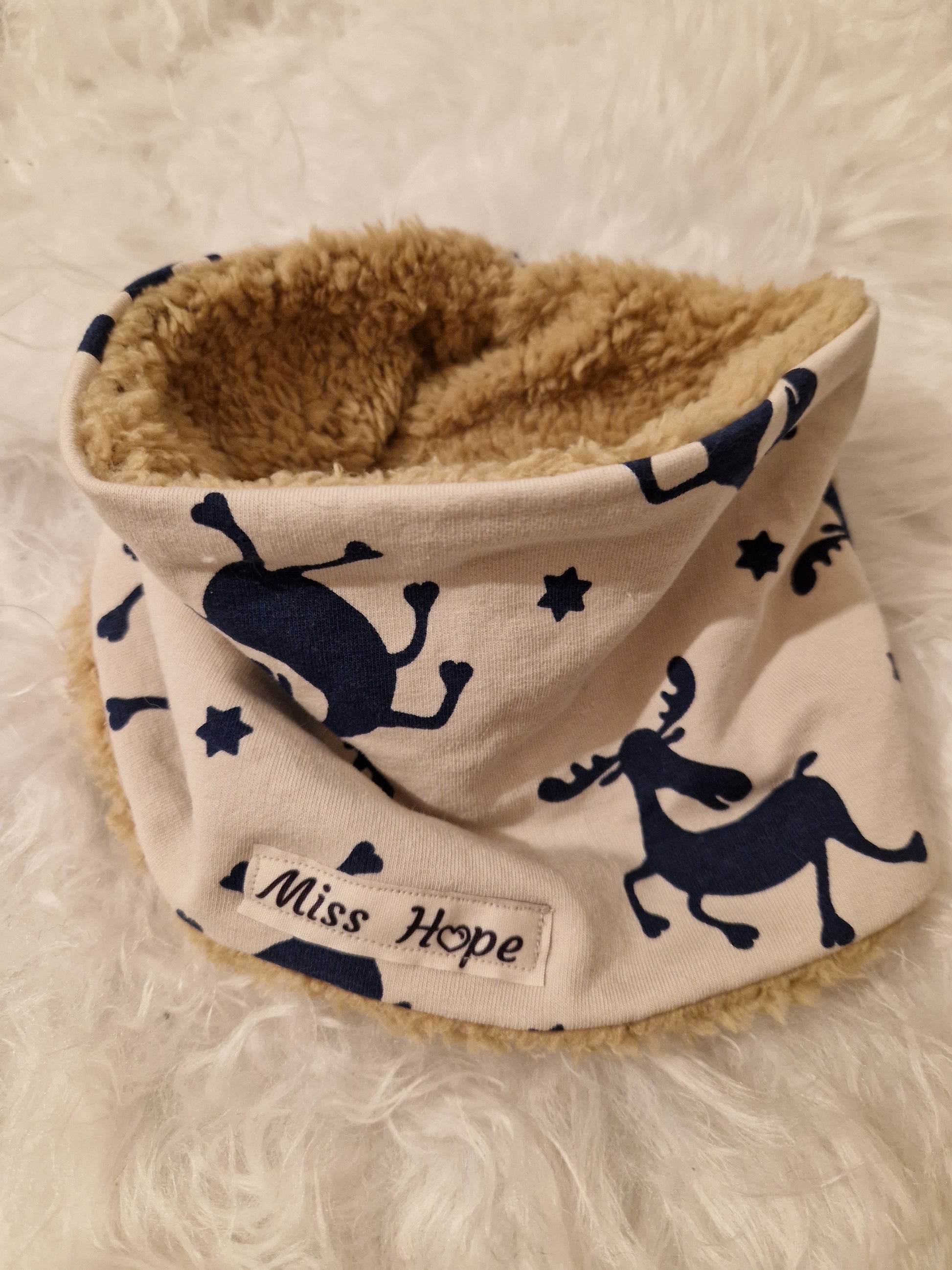 Der Jerseystoff außen ist beige und hat ein Elch Muster. Von innen ist hell brauner Teddystoff verarbeitet, so ist es schön kuschelig warm am Hals.