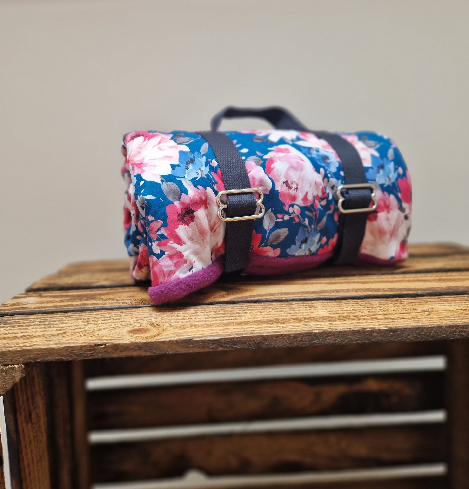 Diese Decke besteht aus Softshell Stoff in dunkel blau mit Blumen. Diese Seite ist Wasserabweisend & sehr pflegeleicht. Sie lässt sich problemlos ausschütten oder mit einem feuchten Tuch reinigen. Die andere Seite ist auf kuscheligen weichen Fleece, der lila ist.