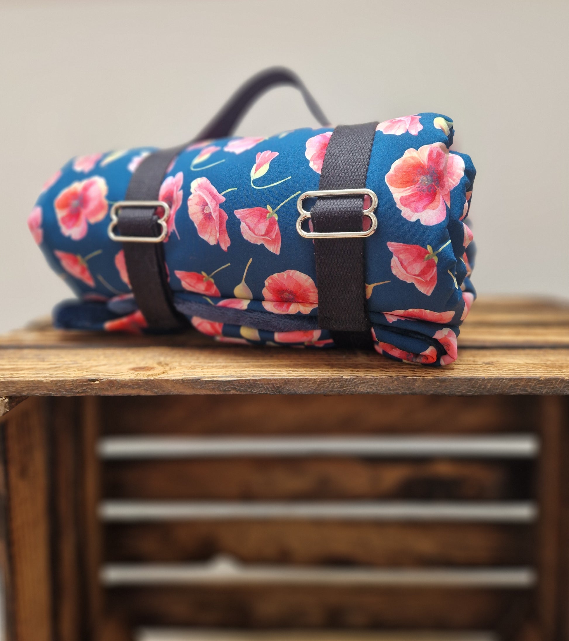 Diese Decke besteht aus Softshell Stoff in dunkelblau mit Mohnblumen.Diese Seite ist Wasserabweisend & sehr pflegeleicht. Sie lässt sich problemlos ausschütten oder mit einem feuchten Tuch reinigen. Die andere Seite ist auf kuscheligen weichen Fleece, in royal blau.