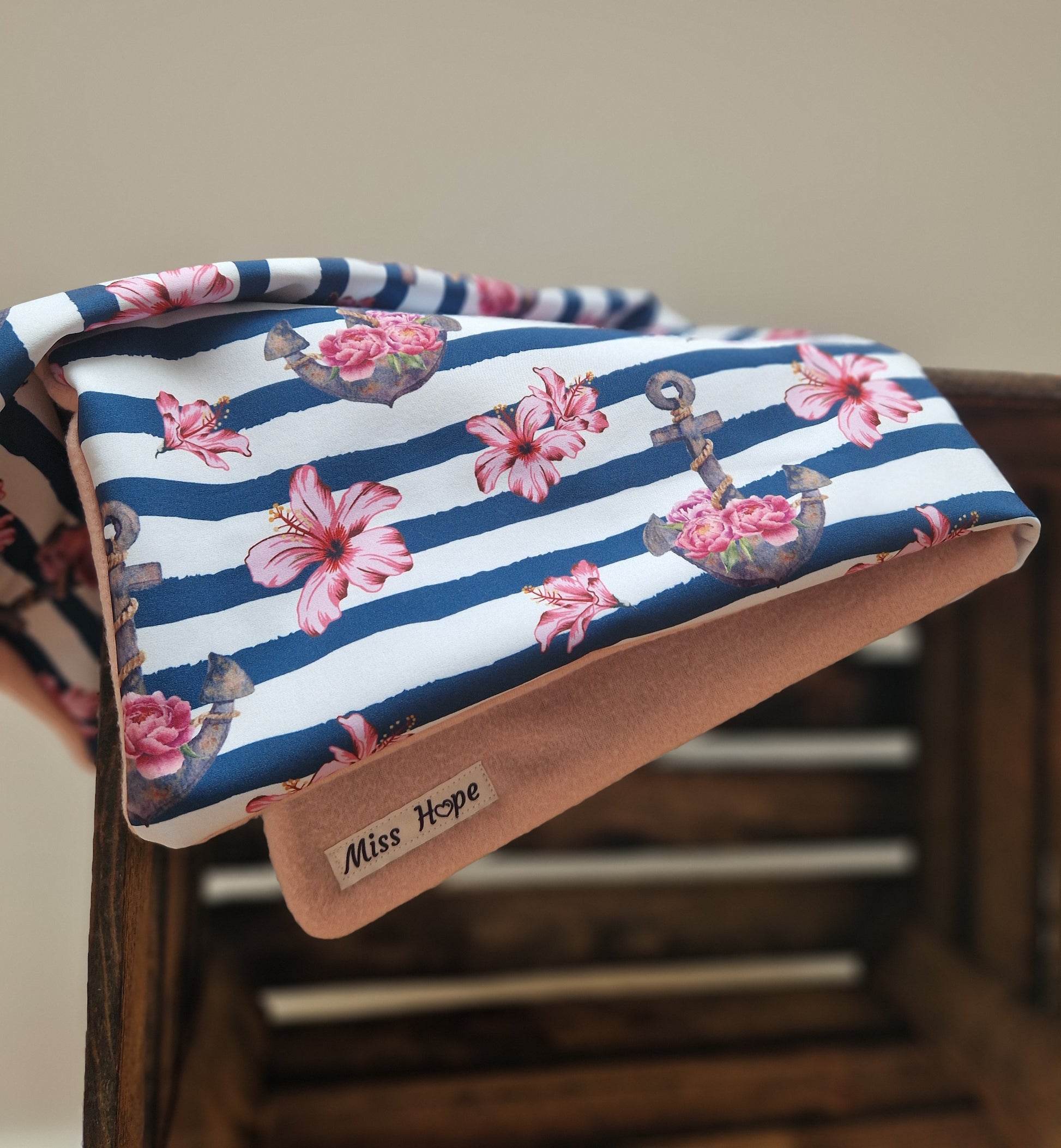 Diese Decke besteht aus Softshell Stoff in gesteiften Anker Look. Diese Seite ist Wasserabweisend & sehr pflegeleicht. Sie lässt sich problemlos ausschütten oder mit einem feuchten Tuch reinigen. Die andere Seite ist auf exrta leichten kuscheligen weichen Fleece, der altrosa ist.