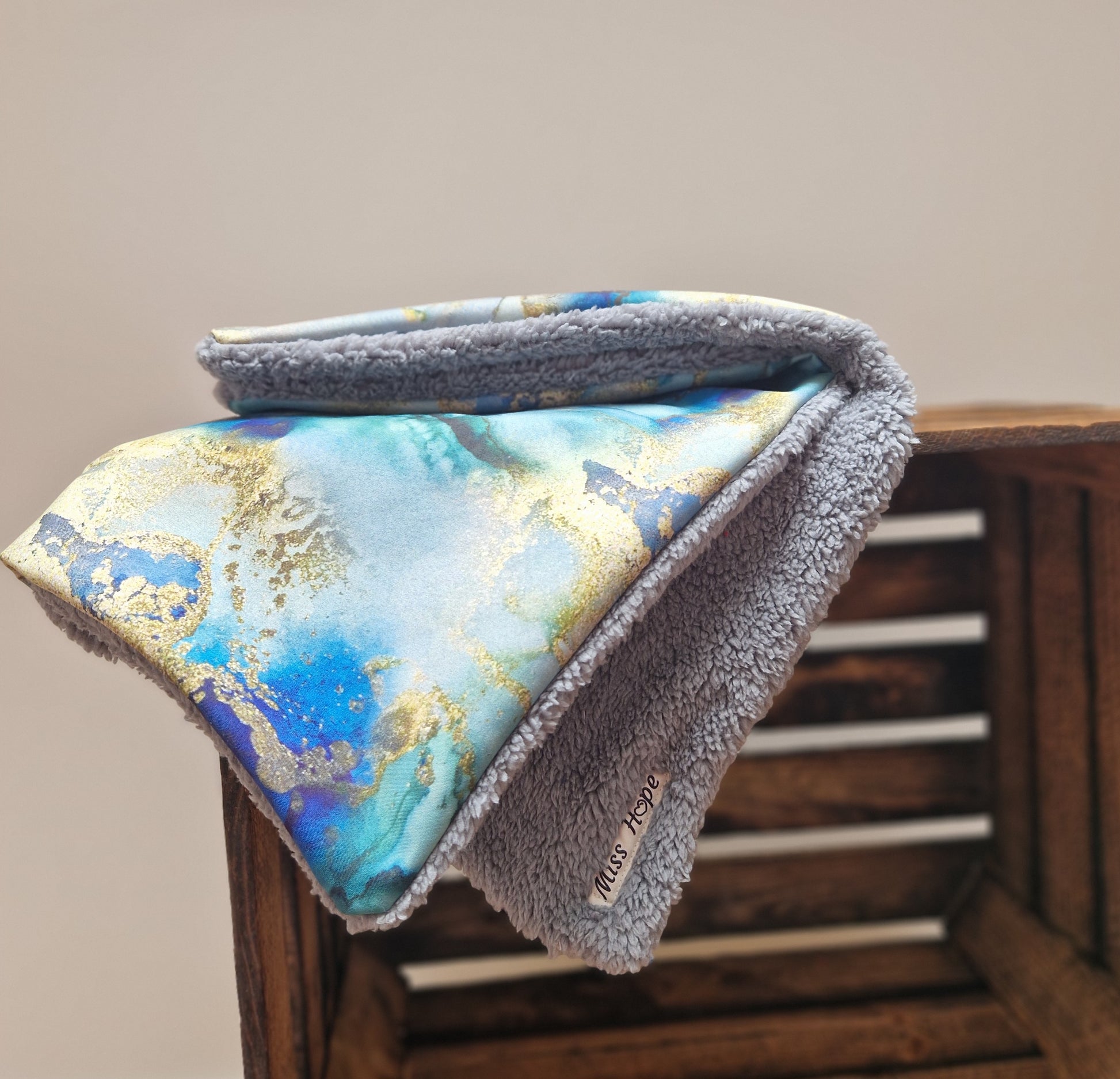 Diese Decke besteht aus Softshell Stoff in blauen farbveräufen. Diese Seite ist Wasserabweisend & sehr pflegeleicht. Sie lässt sich problemlos ausschütten oder mit einem feuchten Tuch reinigen. Die andere Seite ist auf kuscheligen weichen Teddystoff,der grau ist.