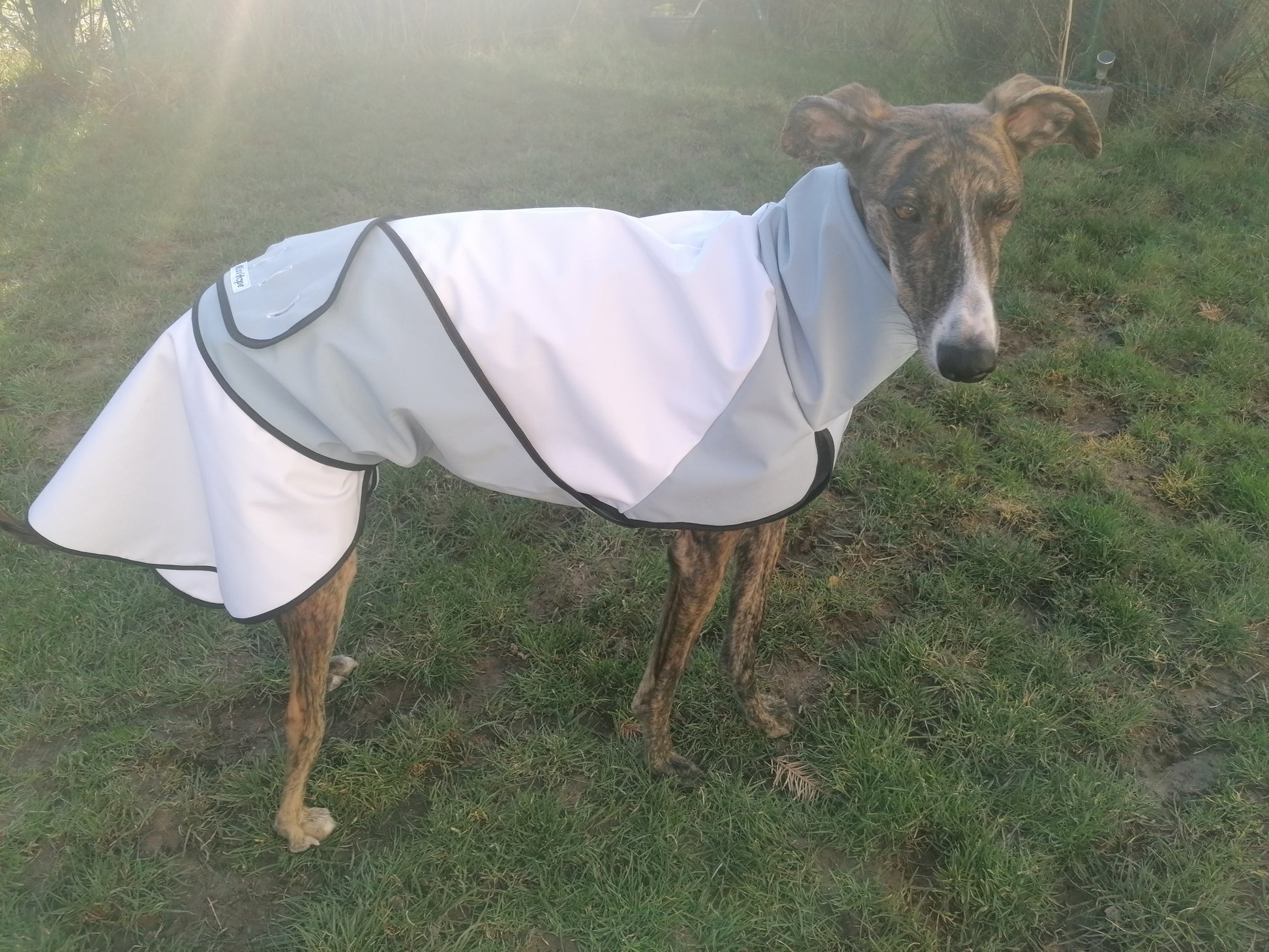 Dieser Mantel ist für Große Galgoretten (und Greyhounds) geeignet. Miss Hope ist eine zierliche, kleine Galga Dame, daher sitzt der Mantel bei ihr nicht.