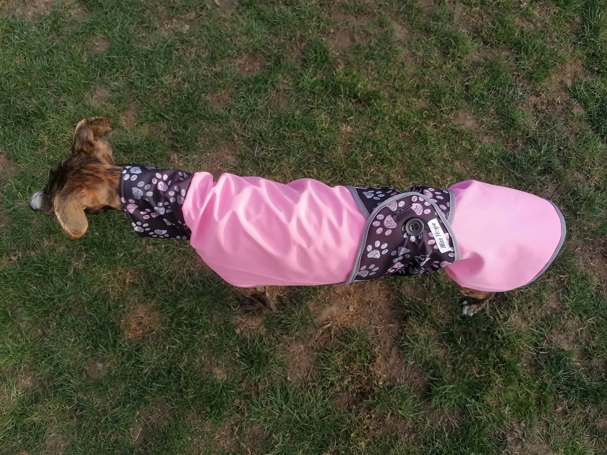 Dieser Mantel hat am Hals und Bauchbereich schwarzen Softshell Stoff mit Pastell farbigen Pfötchenabdrücken drauf, der Rückenbereich besteht aus rosa farbigen Softshell. Der Mantel ist Wind und Wasserabweiden, Robust, Atmungsaktiv und leicht zu tragen. Wie alle Mäntelchen lässt er sich am Rücken mit einem Knopf und auf 5 Einstellungen schließen.