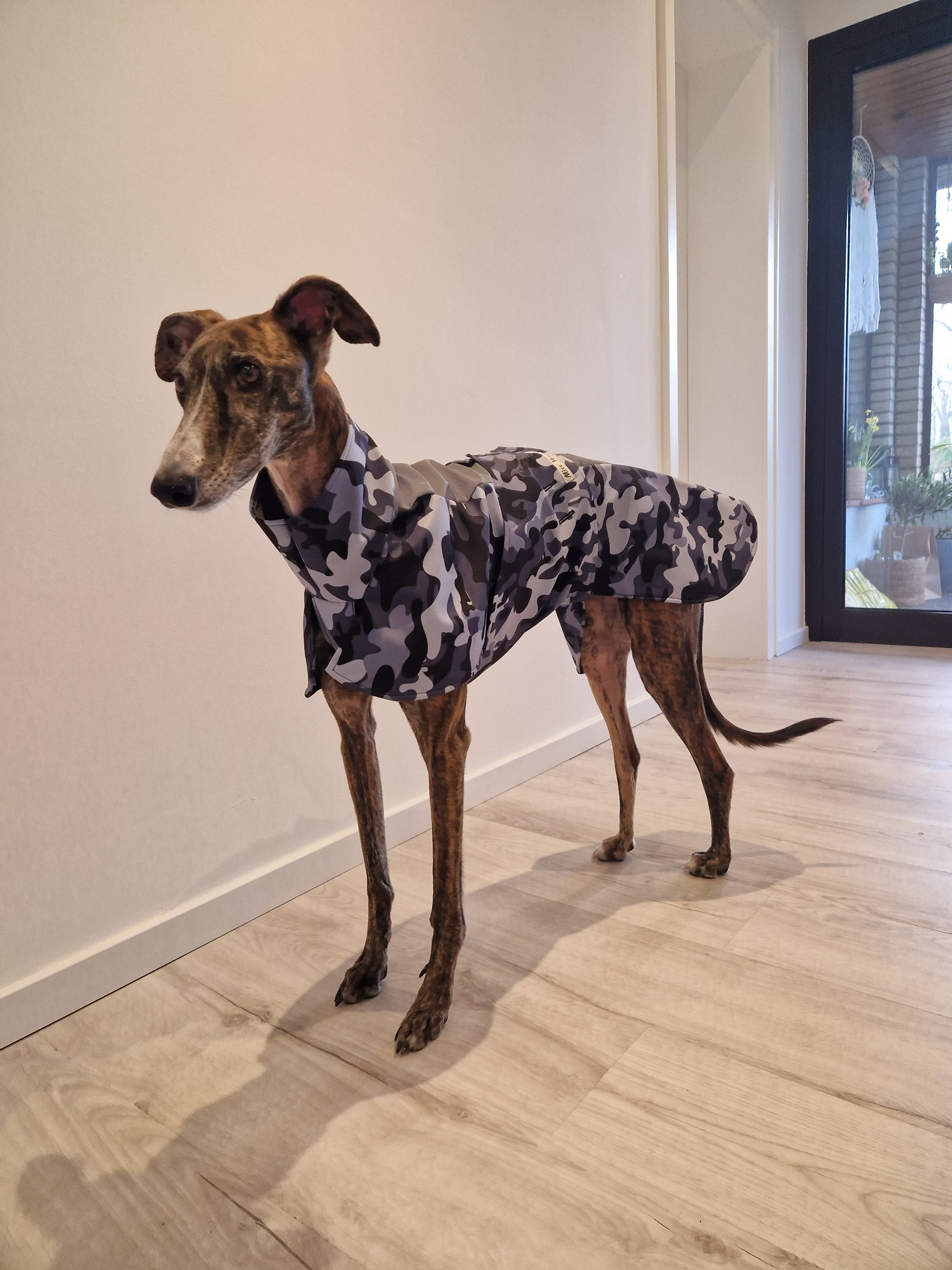 Dieser Tarn Mantel hat am Rücken einen reflektieren Streifen eingearbeitet. Er ist für zarte, kleine Galgos sowie Whippets geeignet.