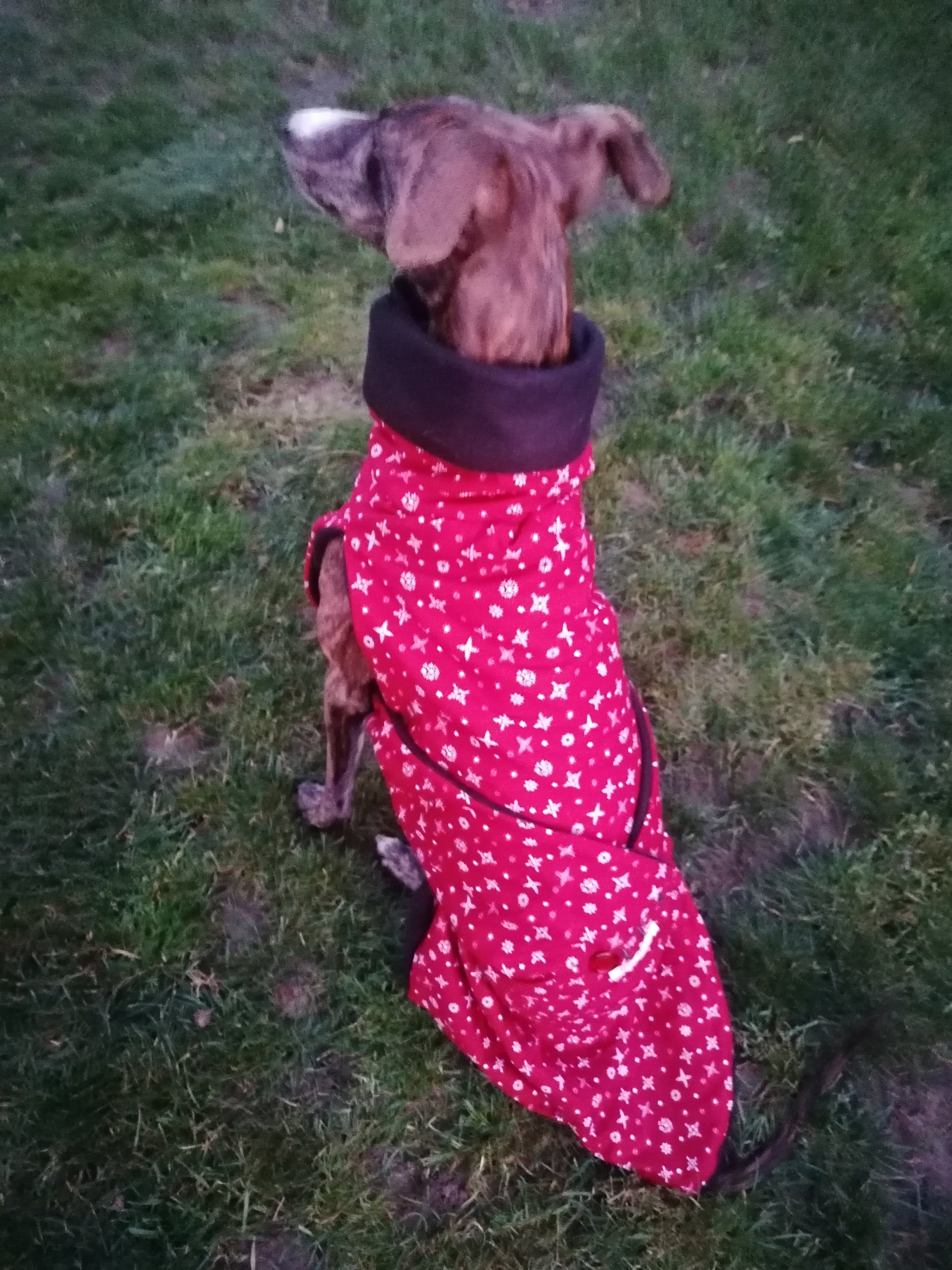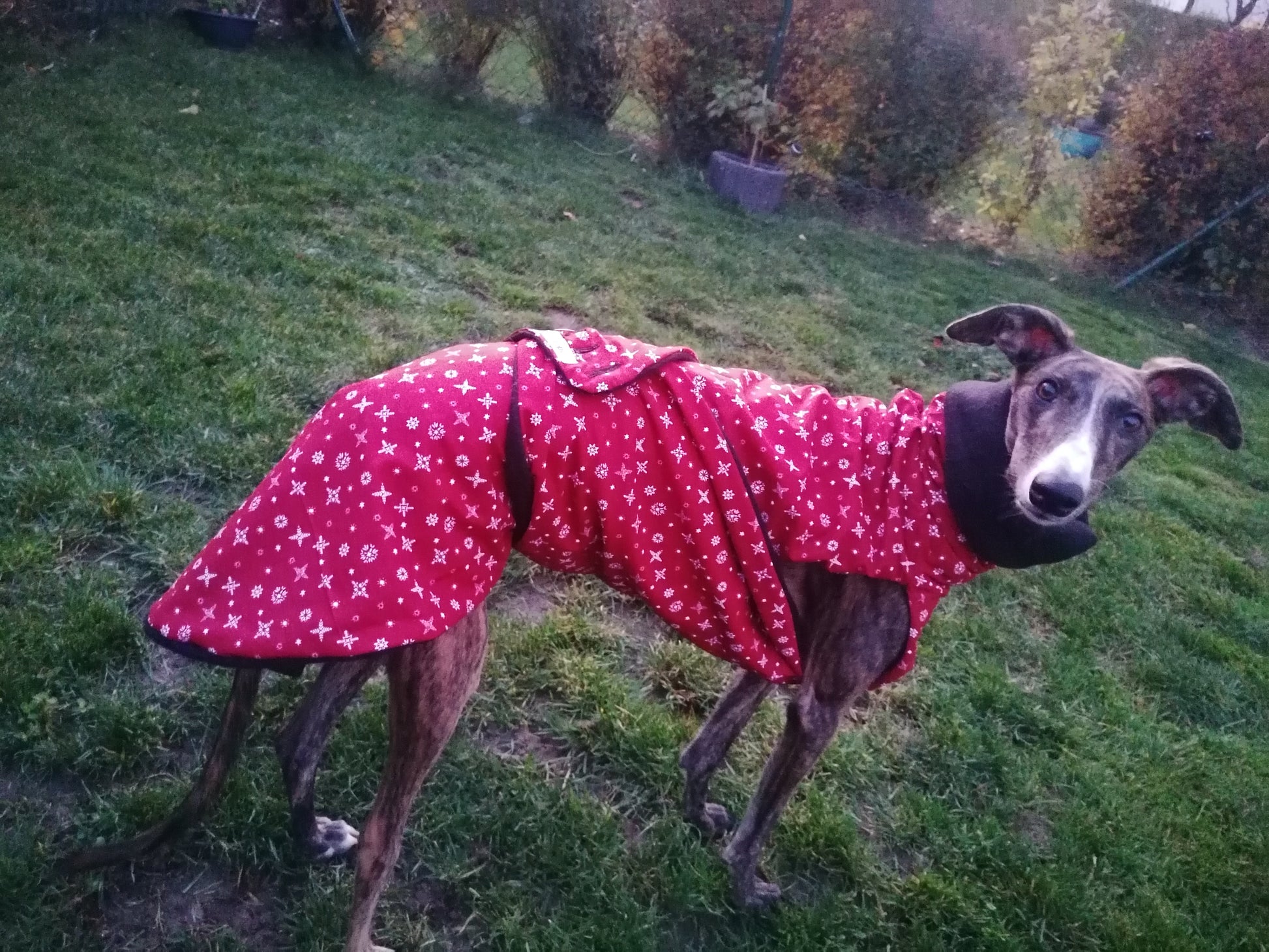 Dunkelroter Mantel mit weißen Schneeflöckchen. Der Innenteil besteht aus schwarzem Fleece und der Mantel lässt sich mit einem Knopf am Rücken schließen. Dieser Mantel hat 4 Knopflöcher für die perfekte Einstellung.