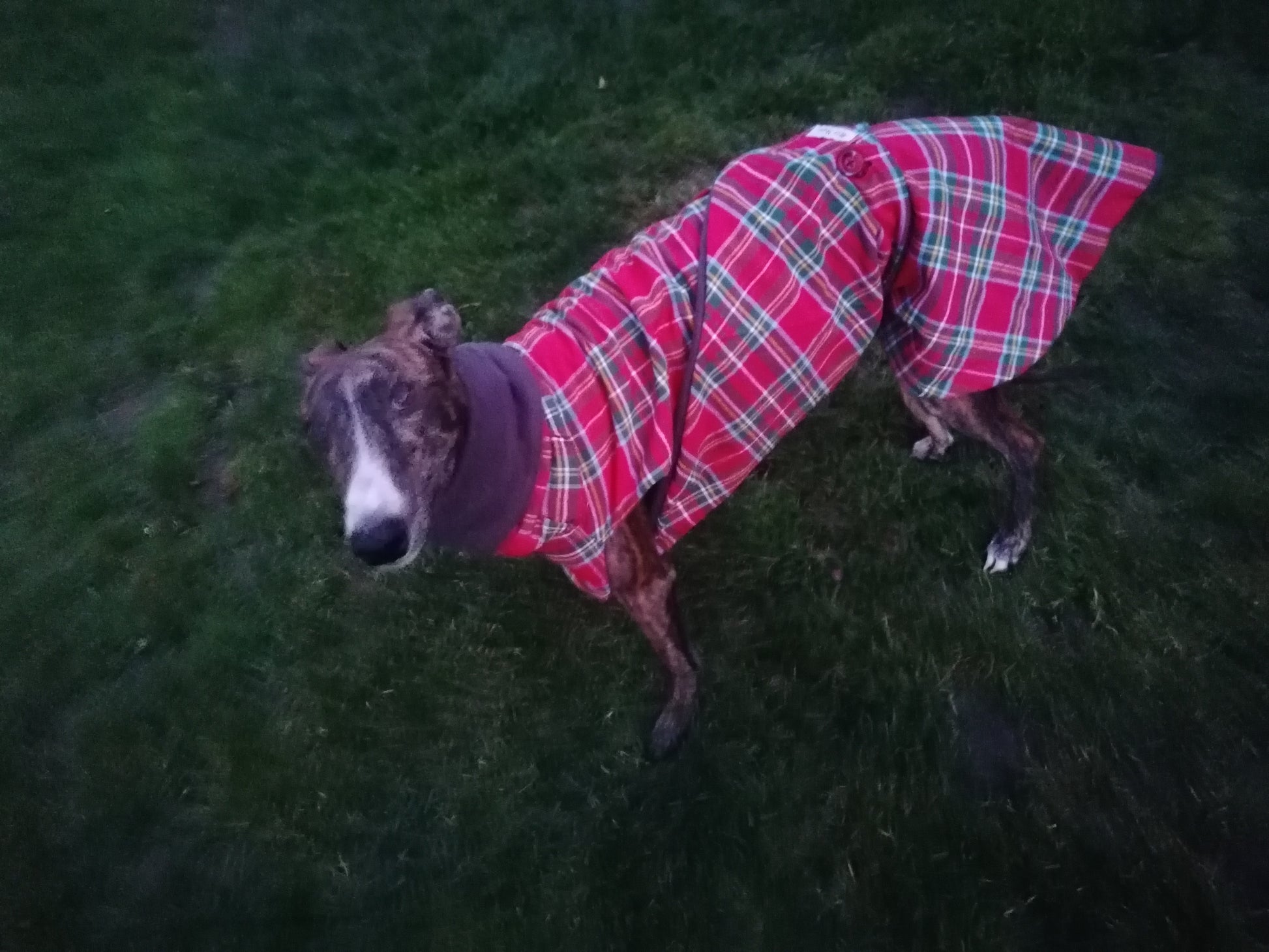 Die Rückenlänge beträgt 83cm, der Halsumfang 44cm und der Bauchgurt 71 cm.Dieser Mantel ist für größere Galgos & Greyhounds geeignet.