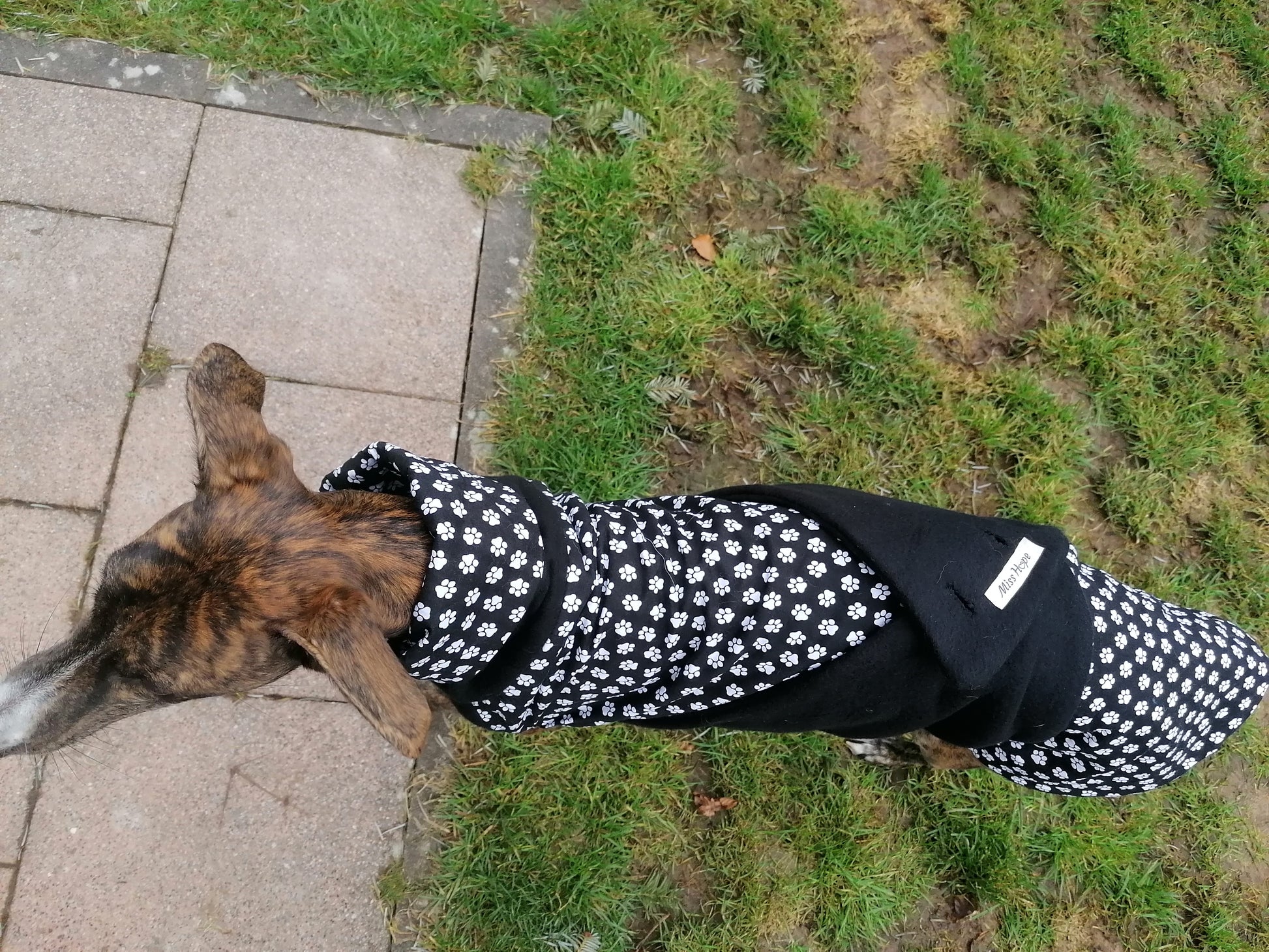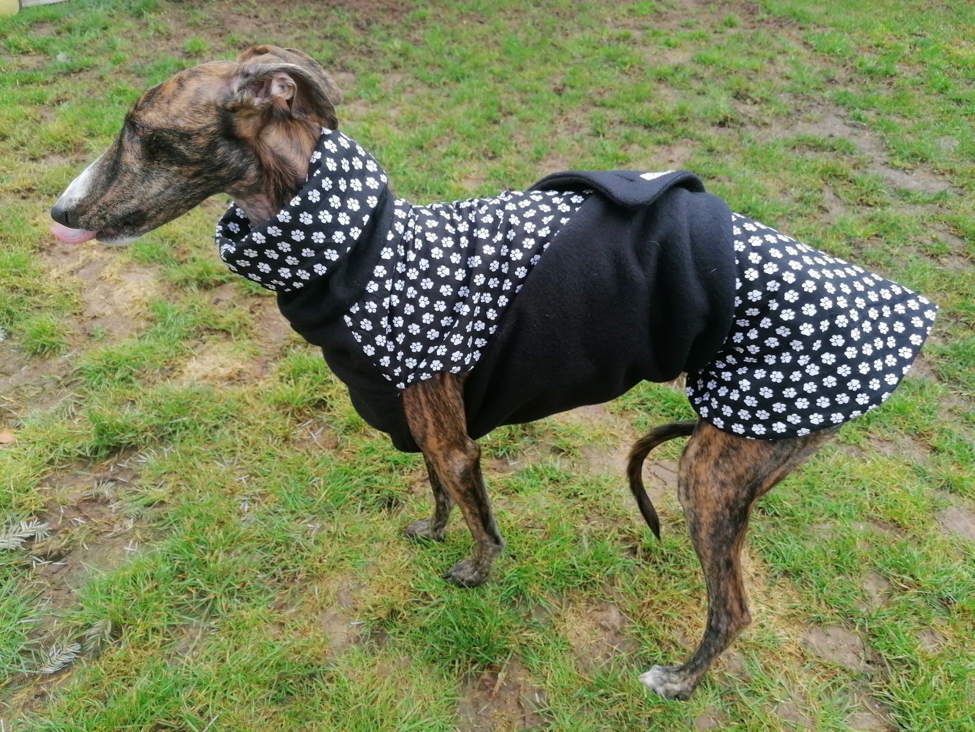 Der Rücken und Halsteil ist mit schwarzen Stoff mit weissen Pfötchen abdrücken Muster verarbeitet und der Innenteil besteht aus schwarzen Fleece. Das Bauchteil besteht komplett auf schwarzen Fleece.