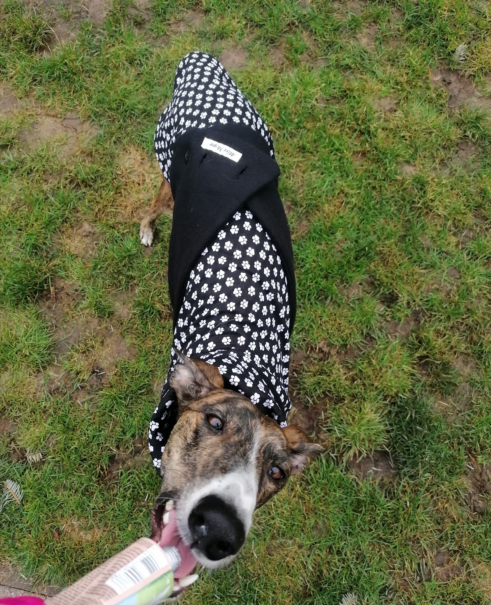 Die Rückenlänge beträgt 66 cm, der Halsumfang 40 cm und der Bauchgurt 77 cm.Dieser Mantel ist für kleine zierliche Galgos und Whippeds geeignet.