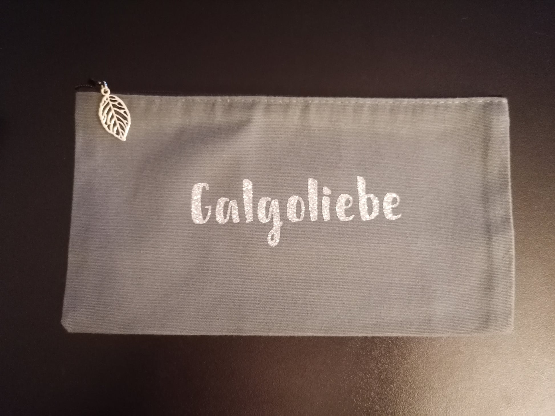 Täschchen in grau mit schwarzen Reißverschluss und silbernen Glitzerschiftzug *Galgoliebe * drauf, 21x12cm groß. An dem Reißverschluss befinden sich ein silbernes Blatt.