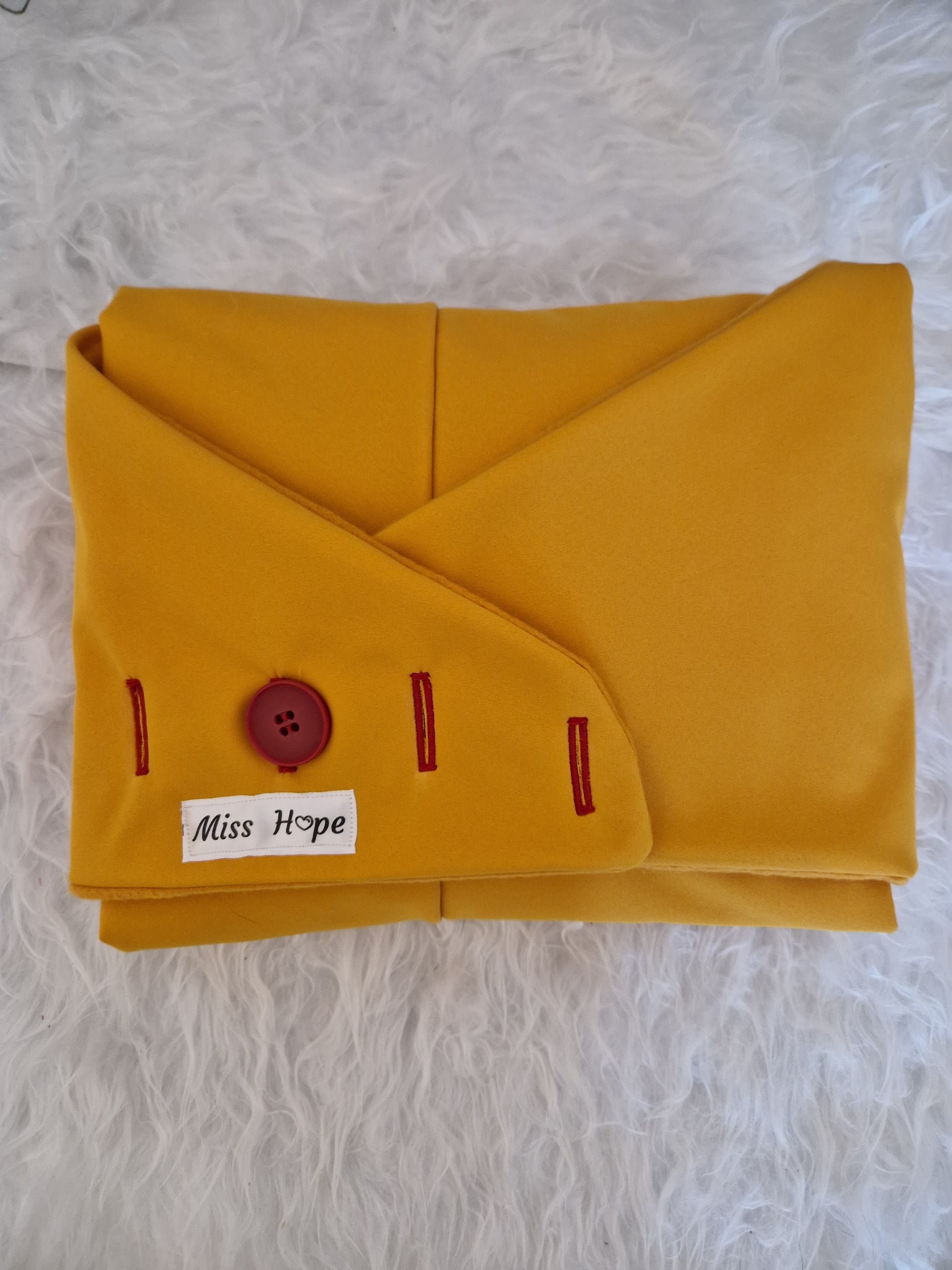 Dieser Stall & Matschmantel ist von außen mit Senfgelben Softshell verarbeitet und von innen mit einem etwas dunklern Senfgelben Fleece. Der Mantel ist Wind und Wasserabweisend, robust, pflegeleicht und waschbar. Er lässt sich auf 5 Stufen einstellen und man muss keine langen Beine durch ein Loch pressen. Dennoch sind Nieren und Bauch geschützt.