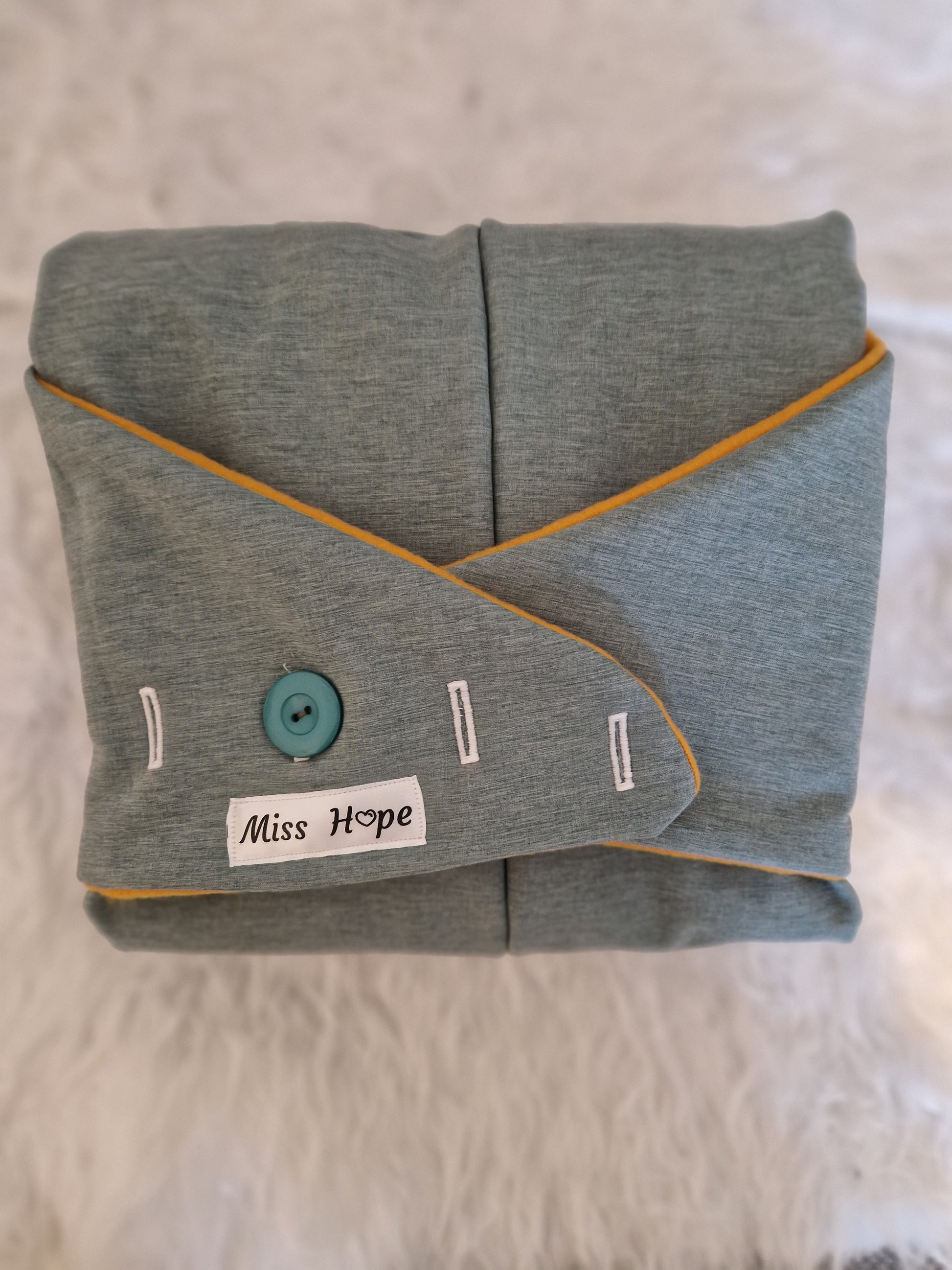 Dieser Stall & Matschmantel ist von außen mit Mintgrün melierten Softshell verarbeitet und von innen mit einem Senfgelben Fleece. Der Mantel ist Wind und Wasserabweisend, robust, pflegeleicht und waschbar. Er lässt sich auf 5 Stufen einstellen und man muss keine langen Beine durch ein Loch pressen. Dennoch sind Nieren und Bauch geschützt.