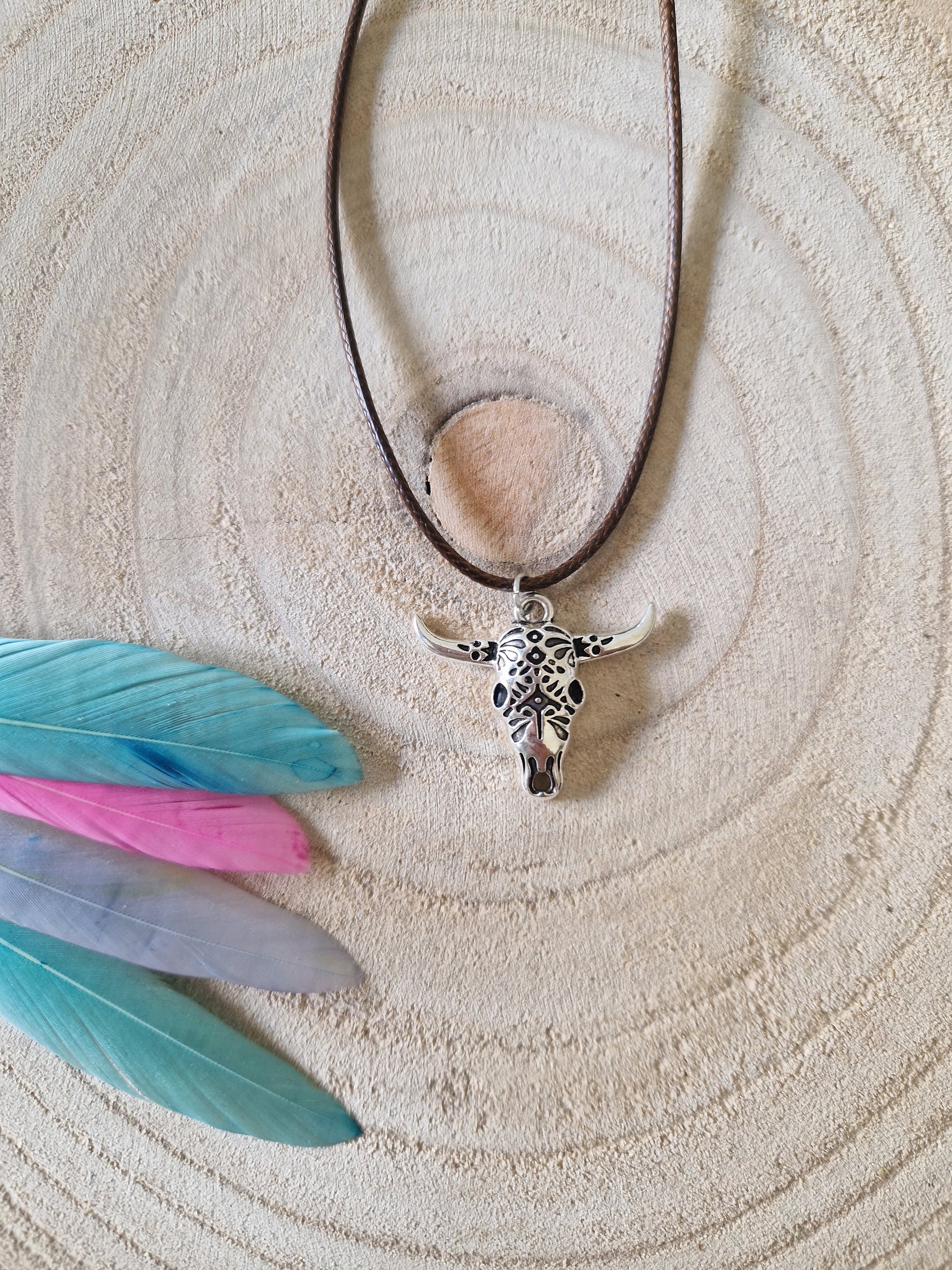 Diese Halskette ist aus Veganem gewachsten Lederband mit Bullenkopfanhänger. Der Anhänger ist 2,5cm x 3cm groß und die Halskette in der Größe verstellbar.