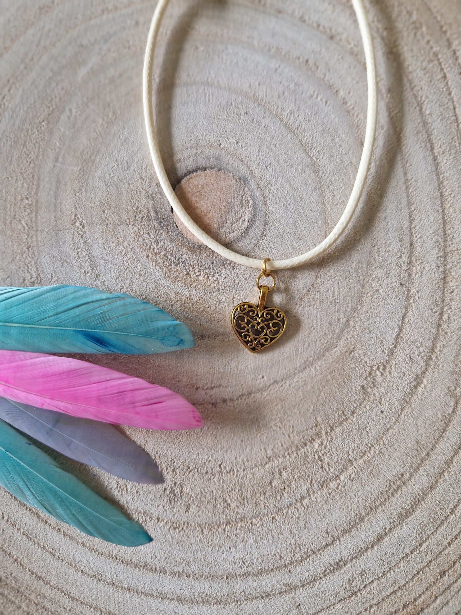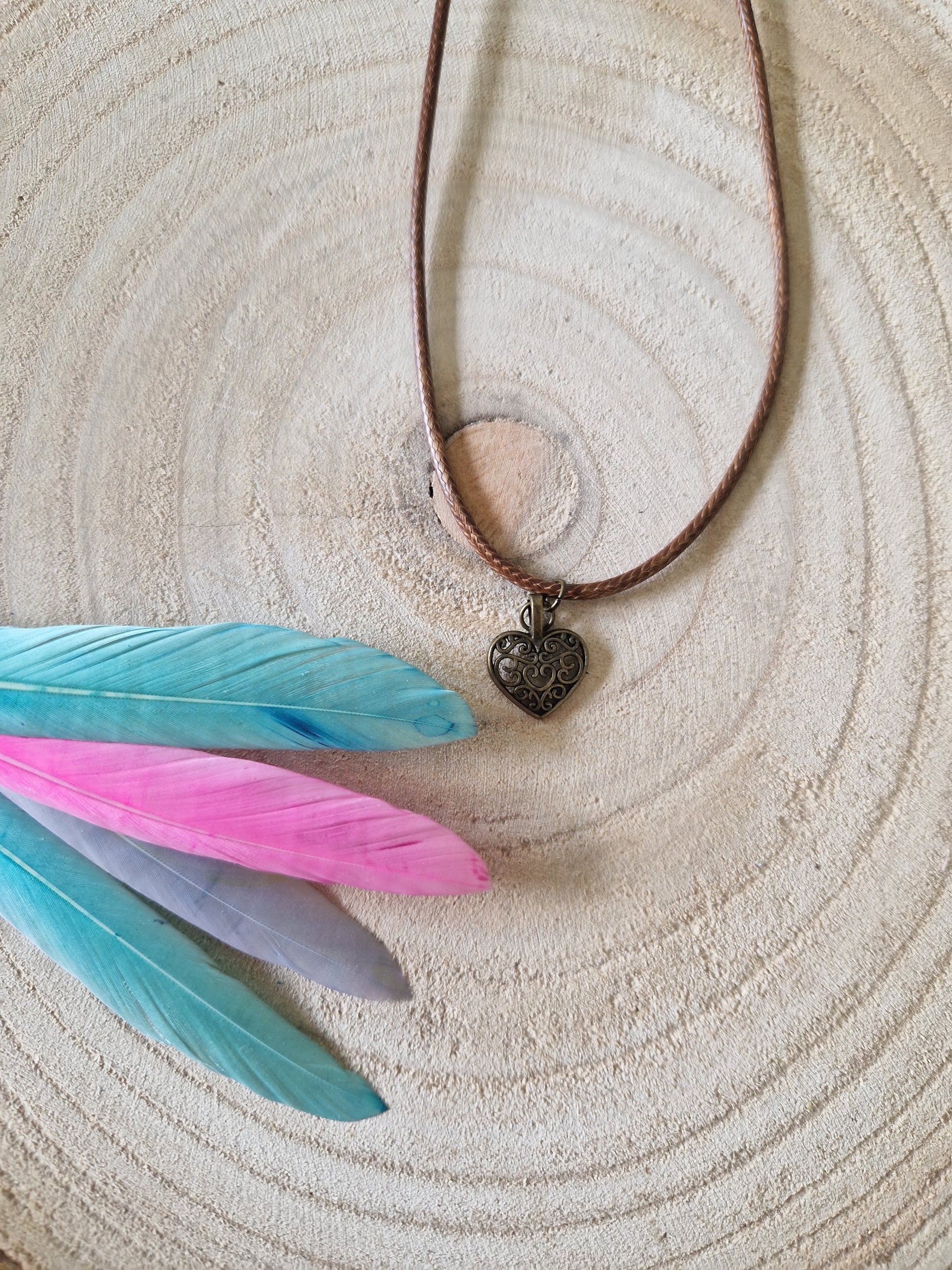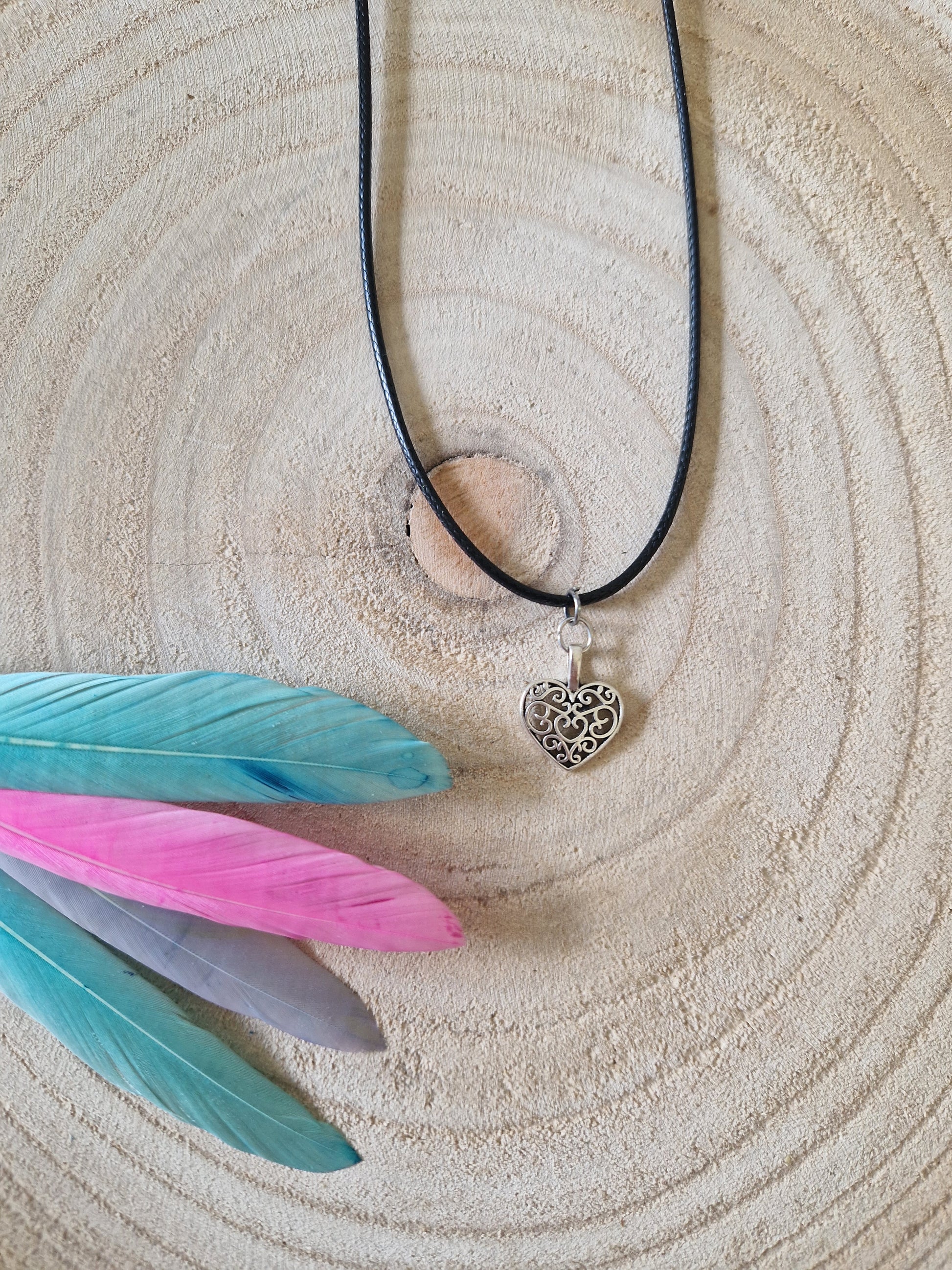 Diese Kette besteht aus veganem gewachsten Lederband und ist auf mehreren Stufen einstellbar. Der niedliche Herzchenanhänger ist aus Modeschmuck und hat eine Größe von ca. 1,7 cm x 1,4cm.
