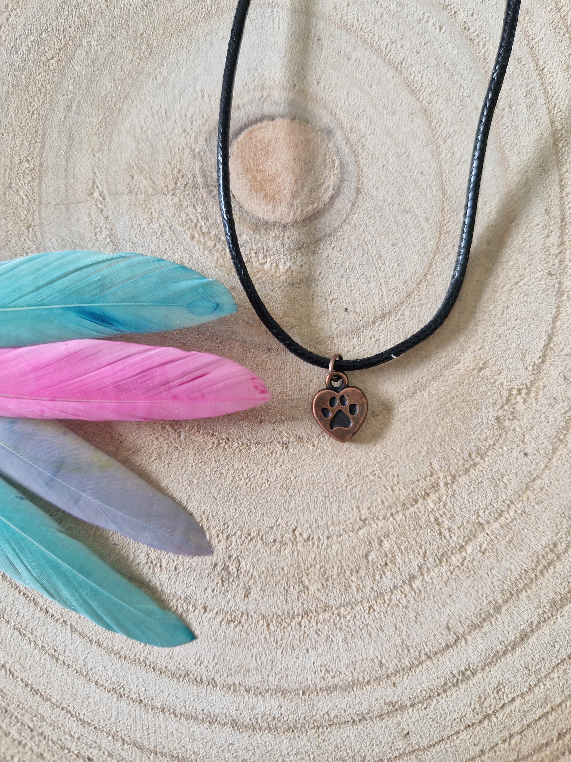 Diese Kette besteht aus veganem gewachsten Lederband und ist auf mehreren Stufen einstellbar. Der niedliche Herzpfötchenanhänger ist aus Modeschmuck und hat eine Größe von ca. 1 cm x 1 cm.