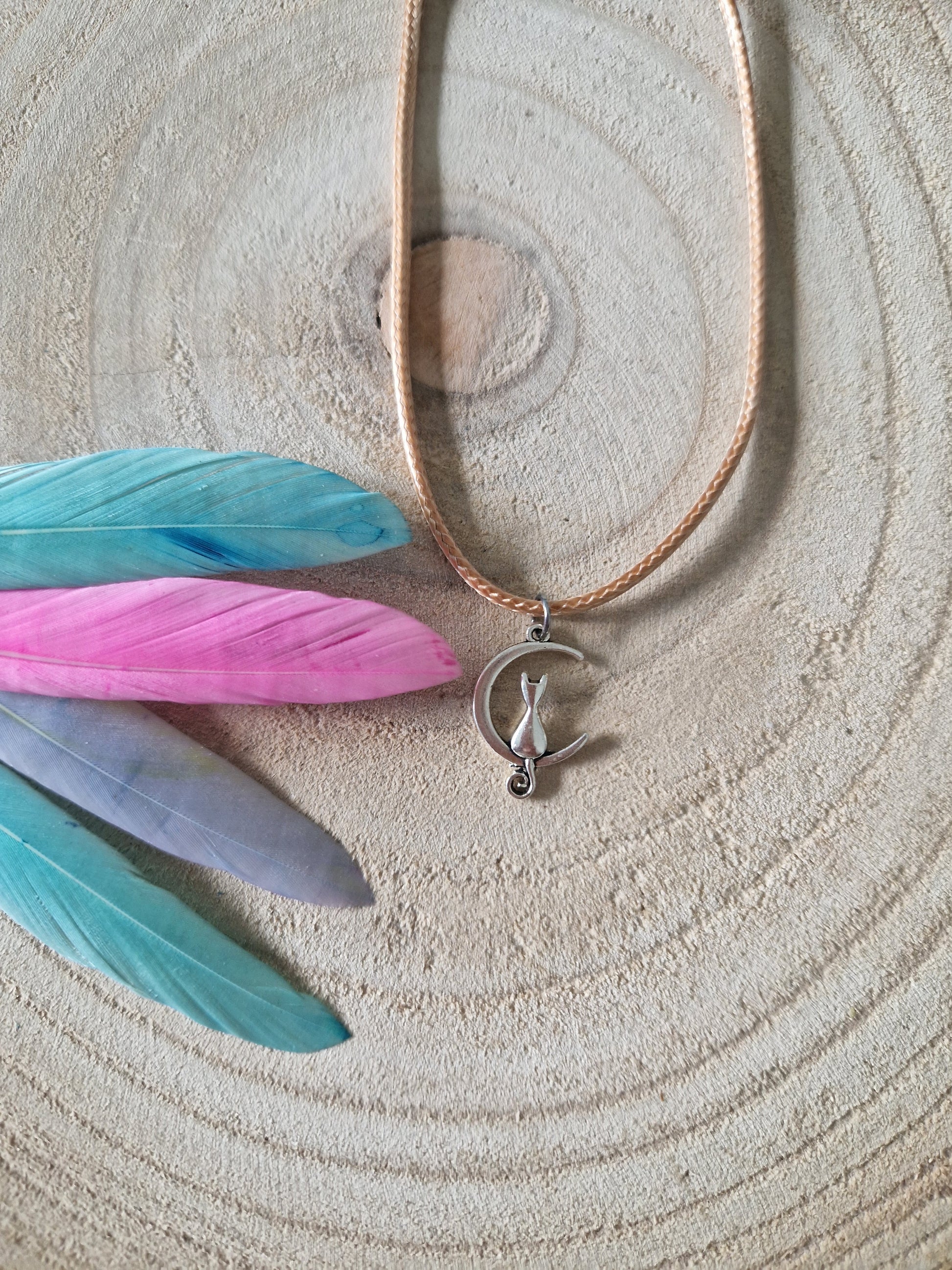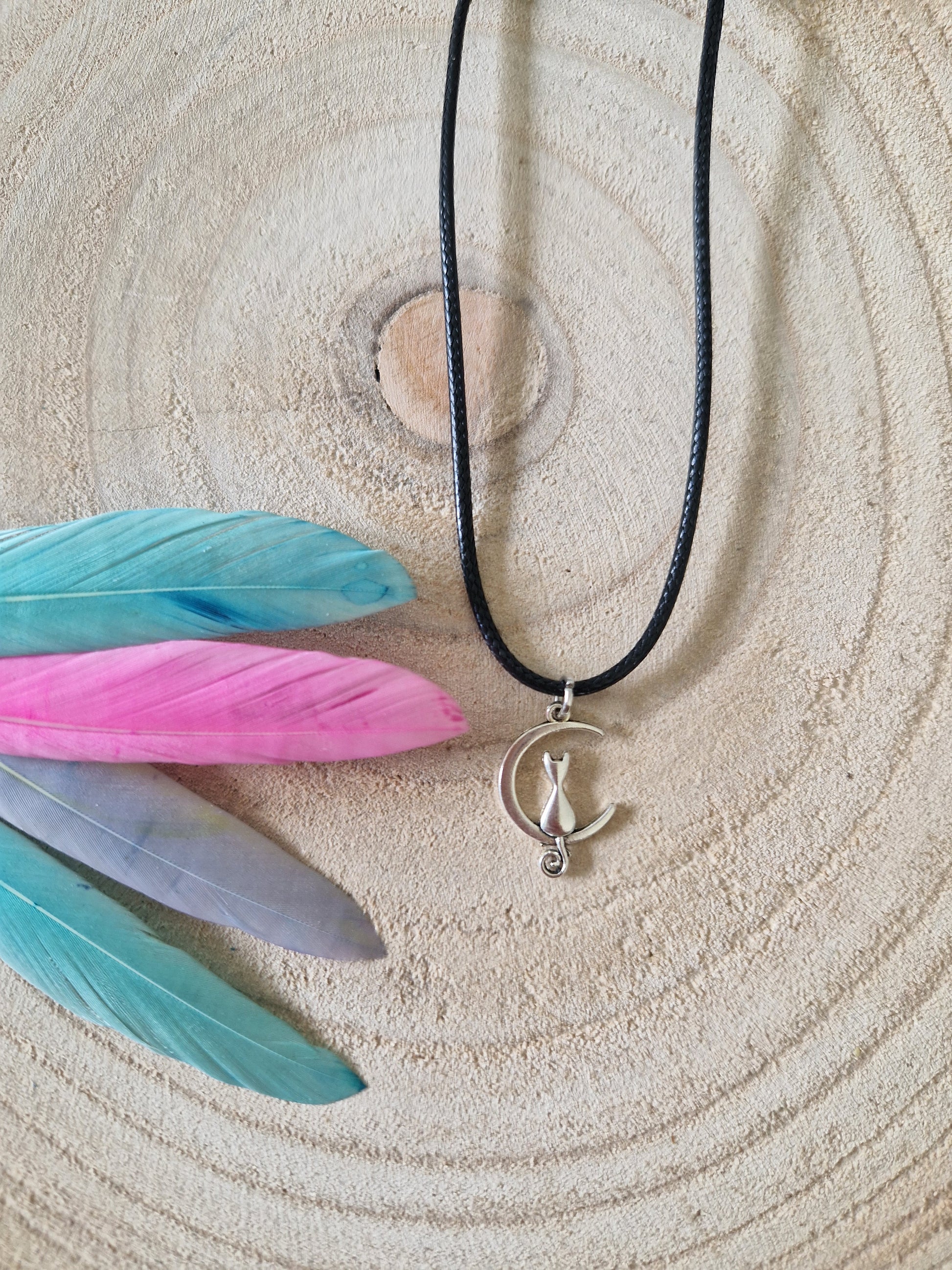 Diese Kette besteht aus veganem gewachsten Lederband und ist auf mehreren Stufen einstellbar. Der niedliche Mondkätzchenanhänger ist aus Modeschmuck und hat eine Größe von ca. 1,8 cm x 1,5 cm.