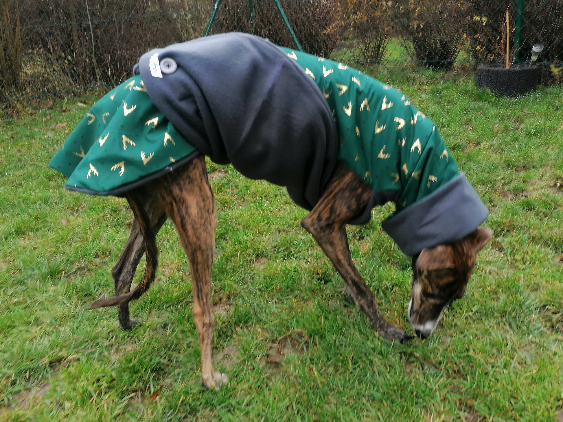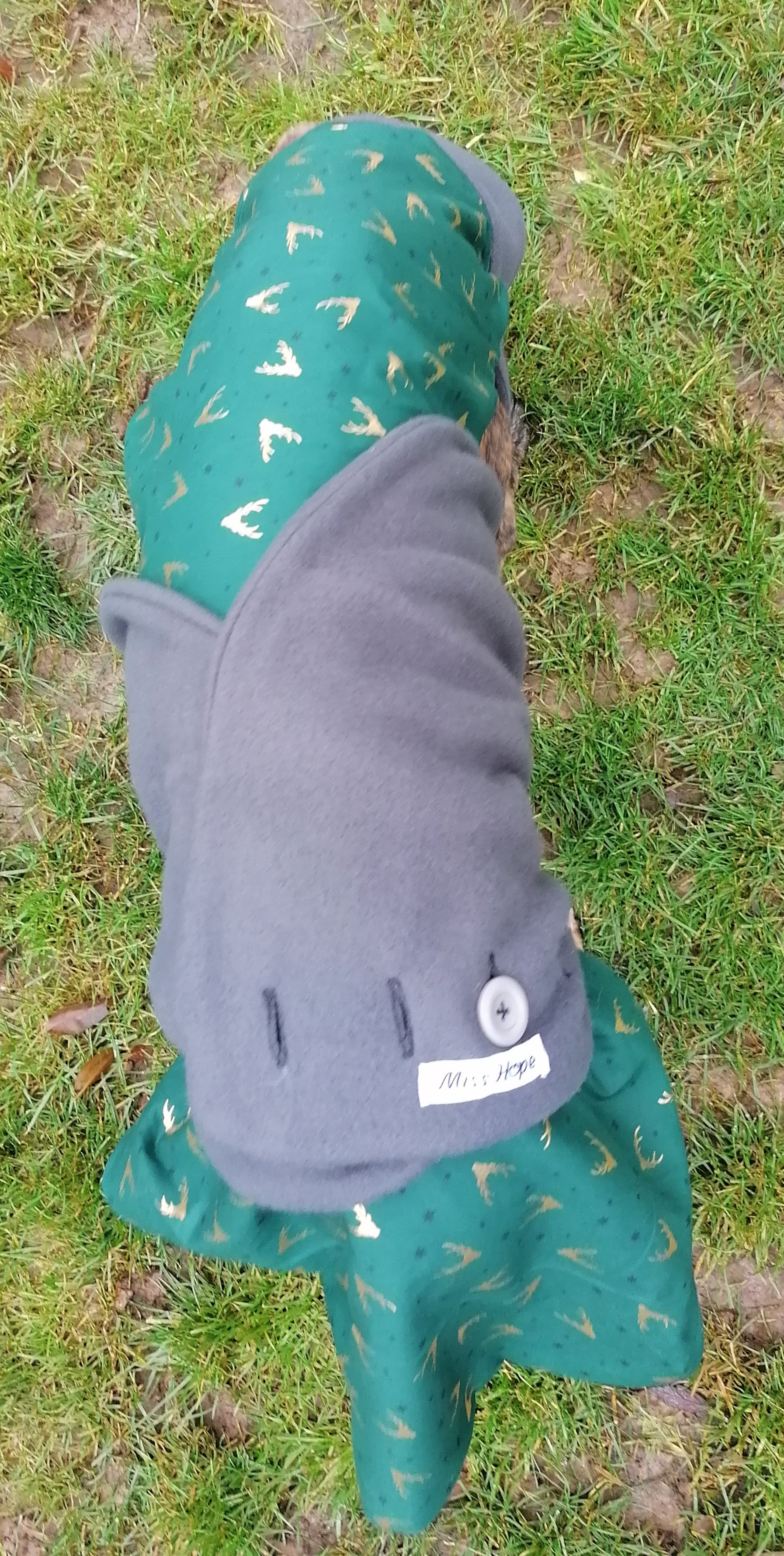 Der Weihnachtsmantel ist dunkel Grün mit kleinen schwarzen Sternchen und goldenen Hirschköpfen.